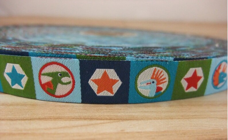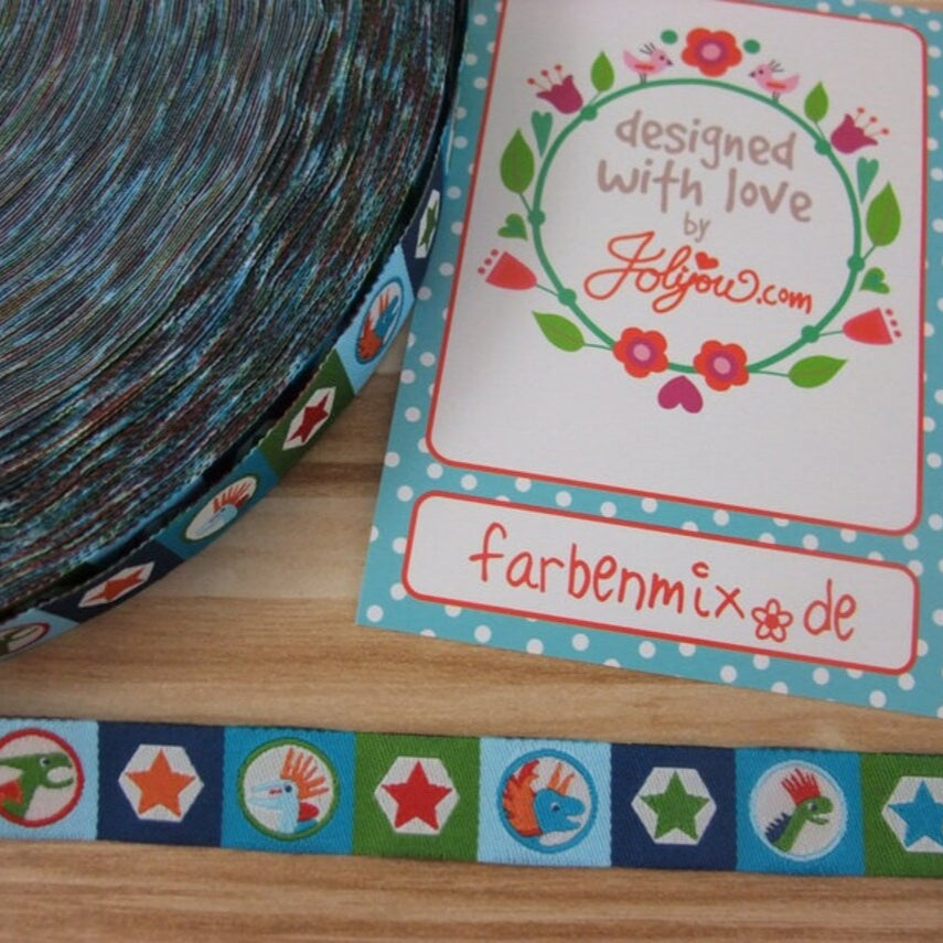 Das Webband Dinopunks von Farbenmix ist ein echter Hingucker für kleine Dino-Fans! Bunte, punkige Dinos mit Sonnenbrillen und coolen Posen tummeln sich auf diesem detailverliebten Band - perfekt zum Verzieren von Kinderkleidung, Taschen, Accessoires oder als witziges Etikett.