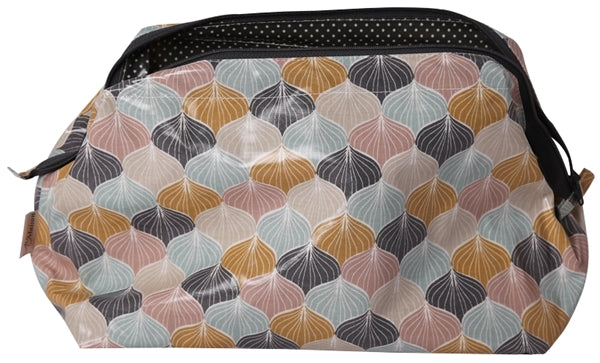 Pflegeleichtes Wachstuch mit Zwiebel Grafik-Muster, mit beige, dunkelgrau, altrosa, gelb und mintfarbenen Nuancen.