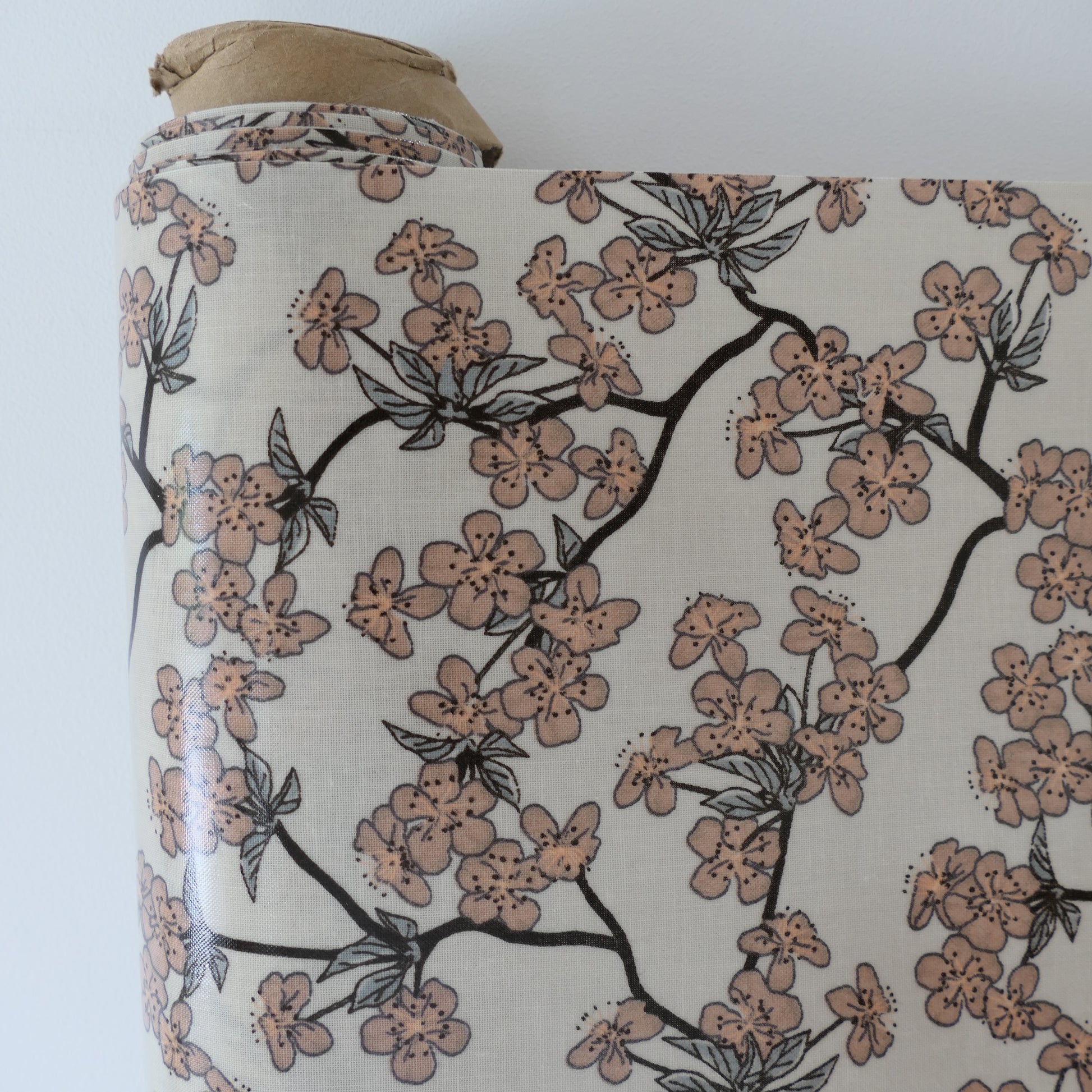 Pflegeleichtes Wachstuch mit schlichtem Kirschzweigen Muster. Der Hintergrund ist cremefarben, die Kirschblüten sind altrosa mit grünen Blättern an braun-grauen Zweigen.