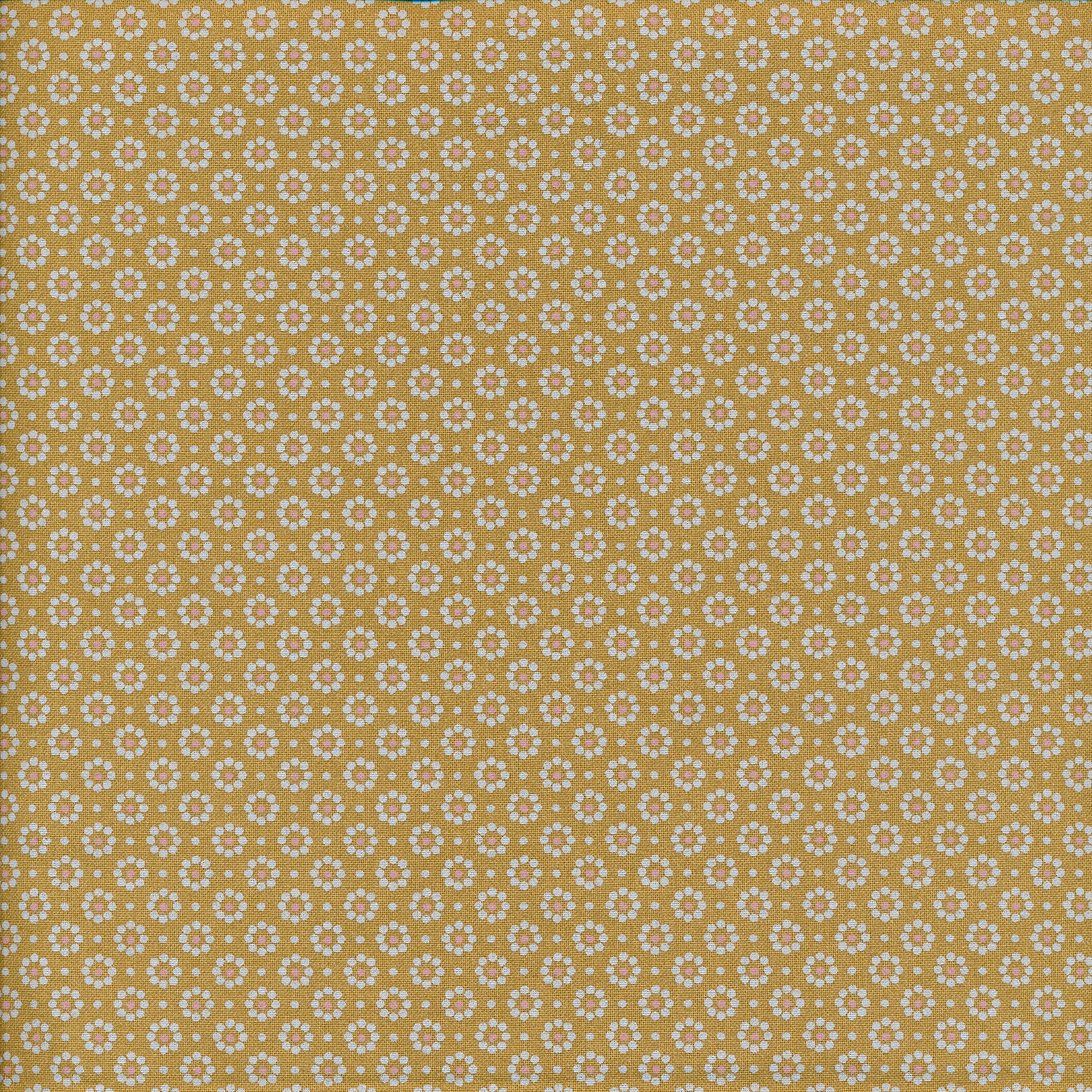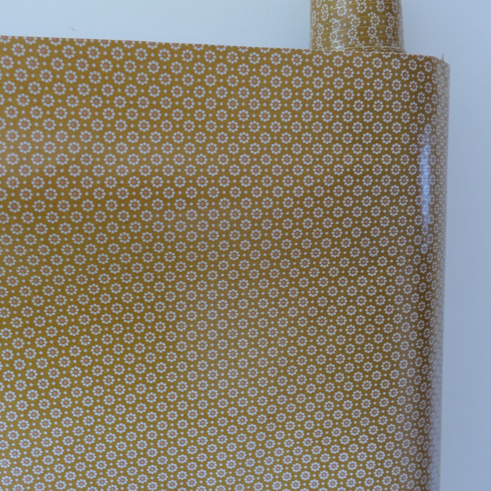 Pflegeleichtes Wachstuch mit gleichmäßigem Blumenmuster, der Hintergrund ist senfgelb, die Blümchen sind cremeweiß.