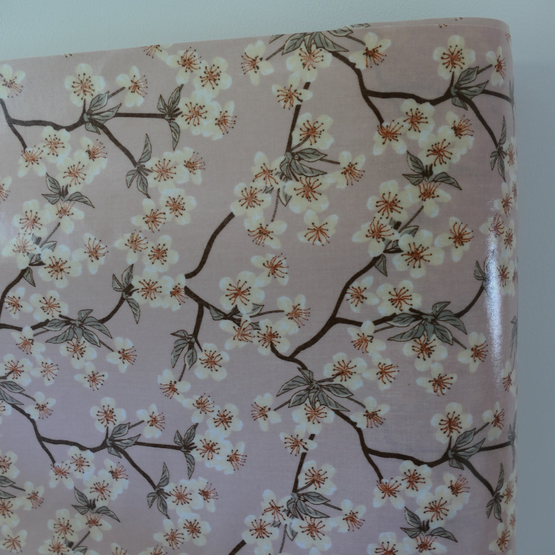 Pflegeleichtes Wachstuch mit schlichtem Kirschzweigen Muster. Der Hintergrund ist altrosa/rosenholzfarben/woodrose, die Kirschblüten sind weiß mit senfgelbem Blütenstempel an braun-grauen Zweigen.