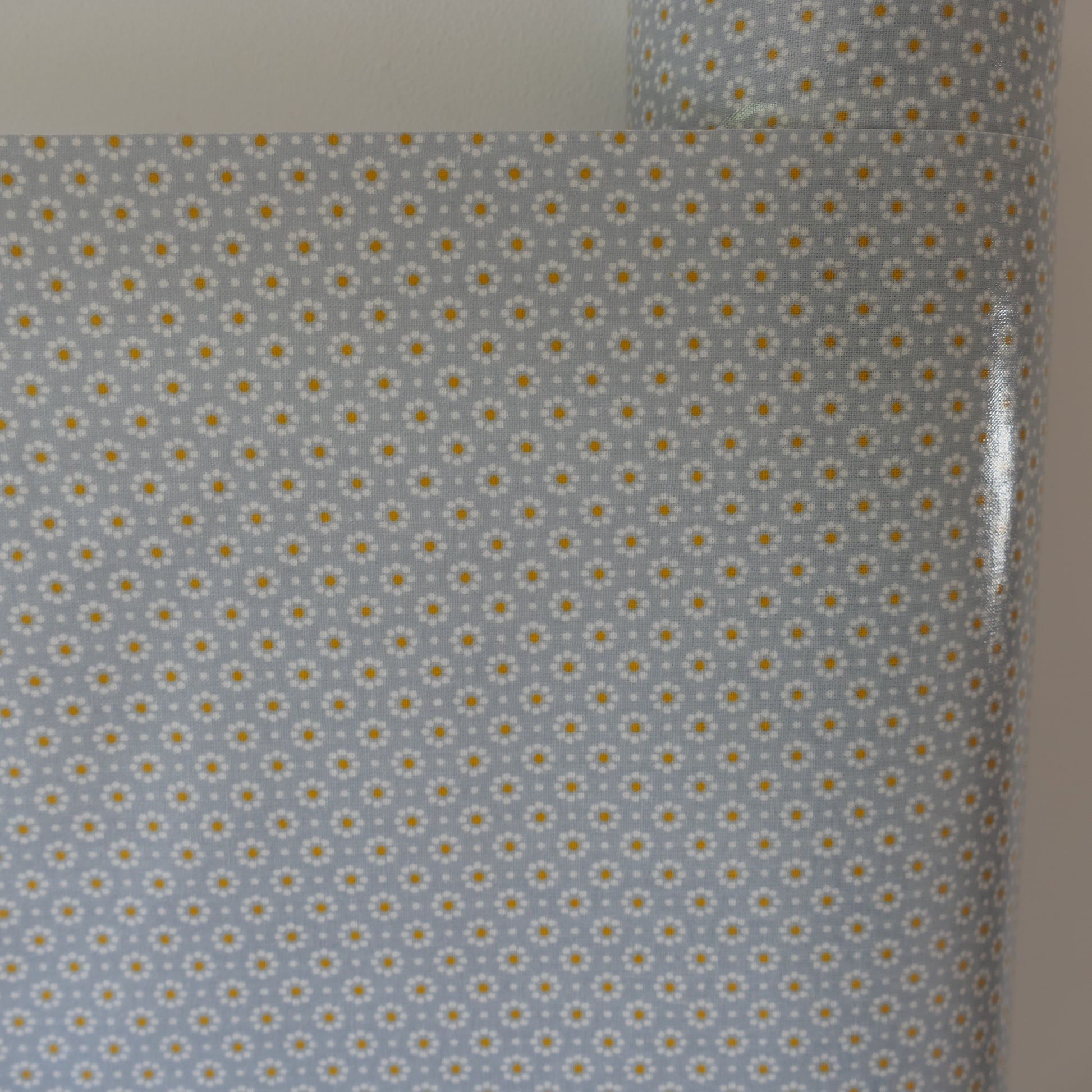 Pflegeleichtes Wachstuch mit gleichmäßigem Blumenmuster und Pünktchen, der Hintergrund ist hellblau/rauchblau, die Blümchen cremeweiß.
