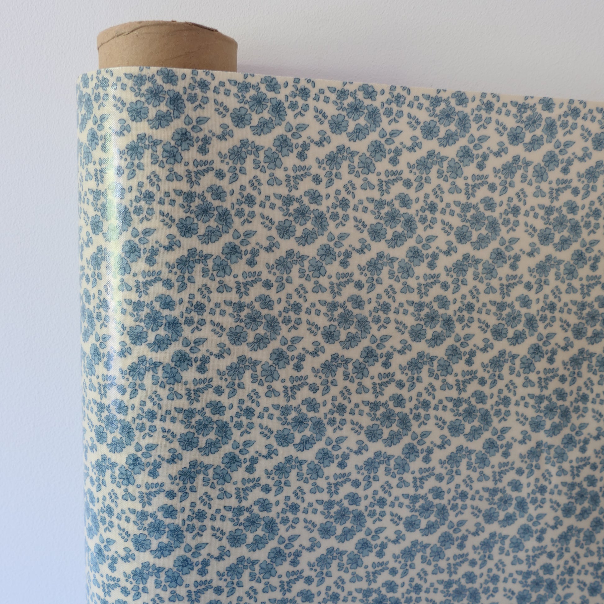 Pflegeleichtes Wachstuch mit verspieltem Blumenmuster in blau und grün.