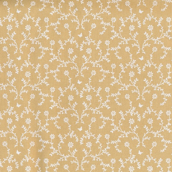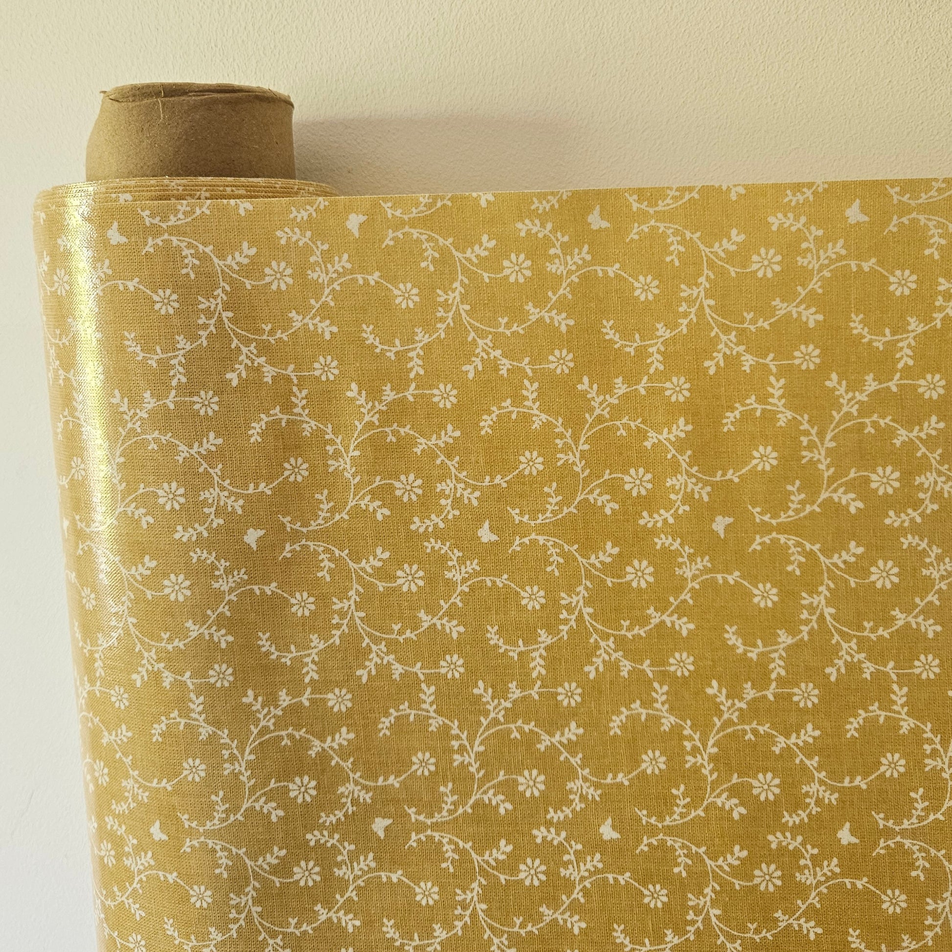 Pflegeleichtes Wachstuch mit filigranen Ranken und Blümchen. Der Hintergrund ist charmant gelb.