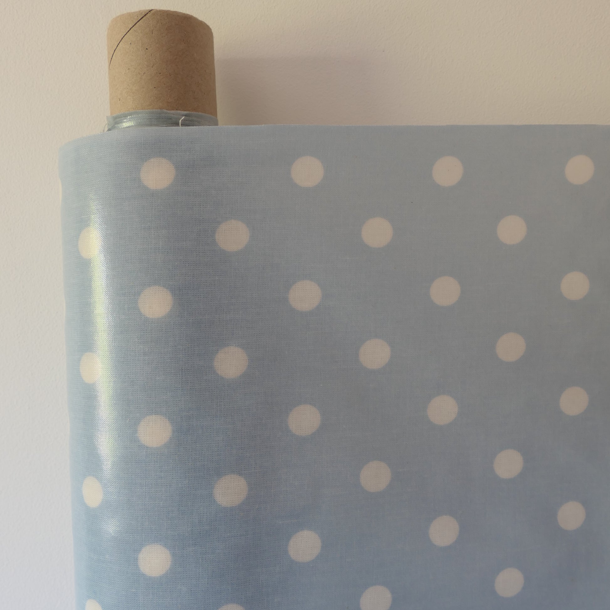 Pflegeleichtes Wachstuch mit großen Punkten, Punktgröße ca. 1,2cm, hellblauer Hintergrund.