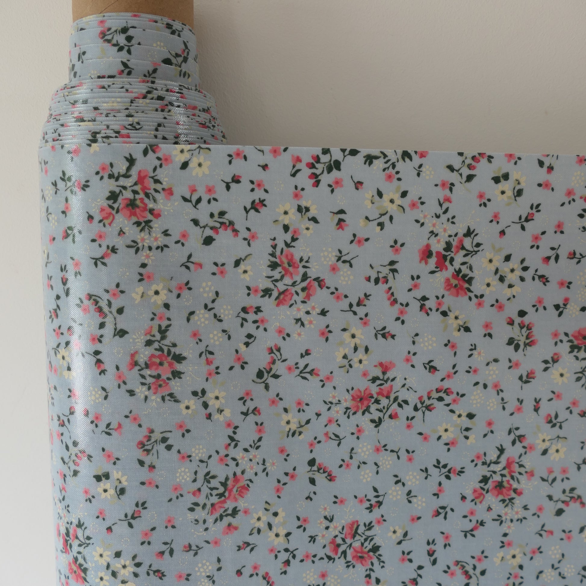 Pflegeleichtes Wachstuch mit fröhlich, verspieltem Blumenmuster. Ein Blumenmeer in rosa und grün auf hellblauem Hintergrund.