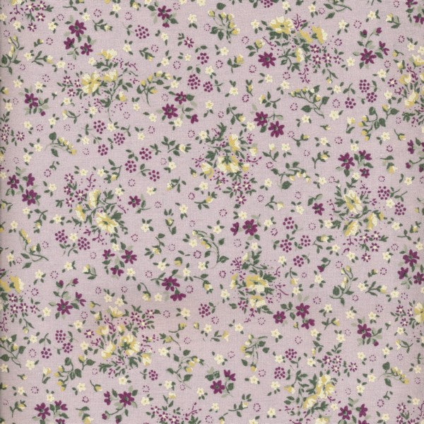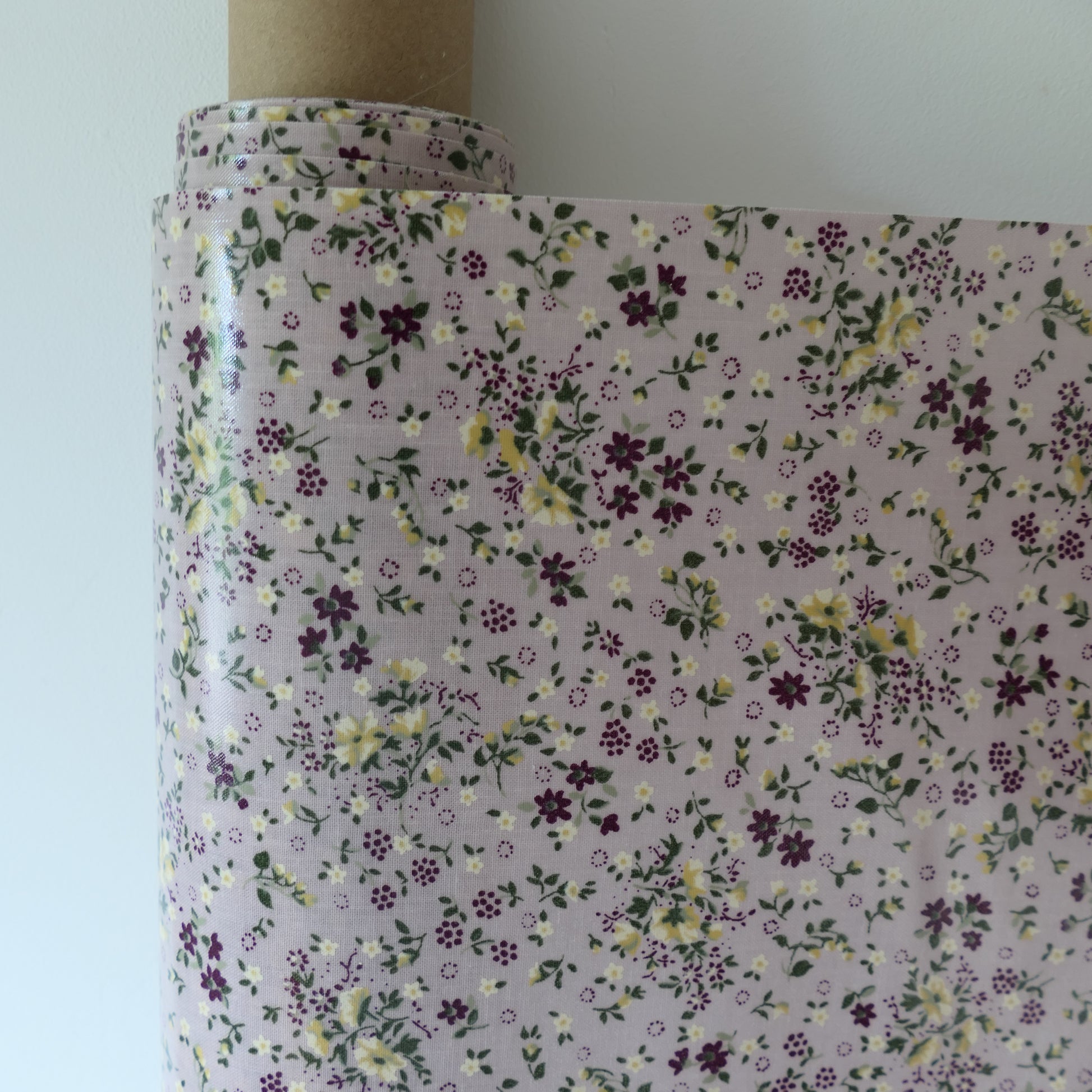 Pflegeleichtes Wachstuch mit fröhlich, verspieltem Blumenmuster. Ein Blumenmeer in lila, gelb und creme auf hell lila Hintergrund.