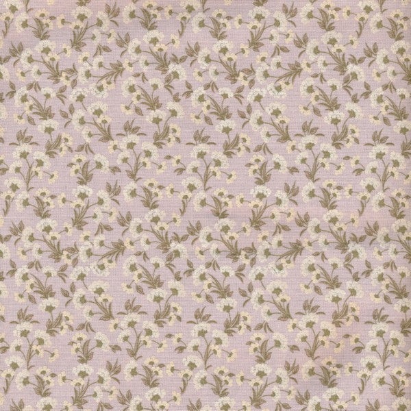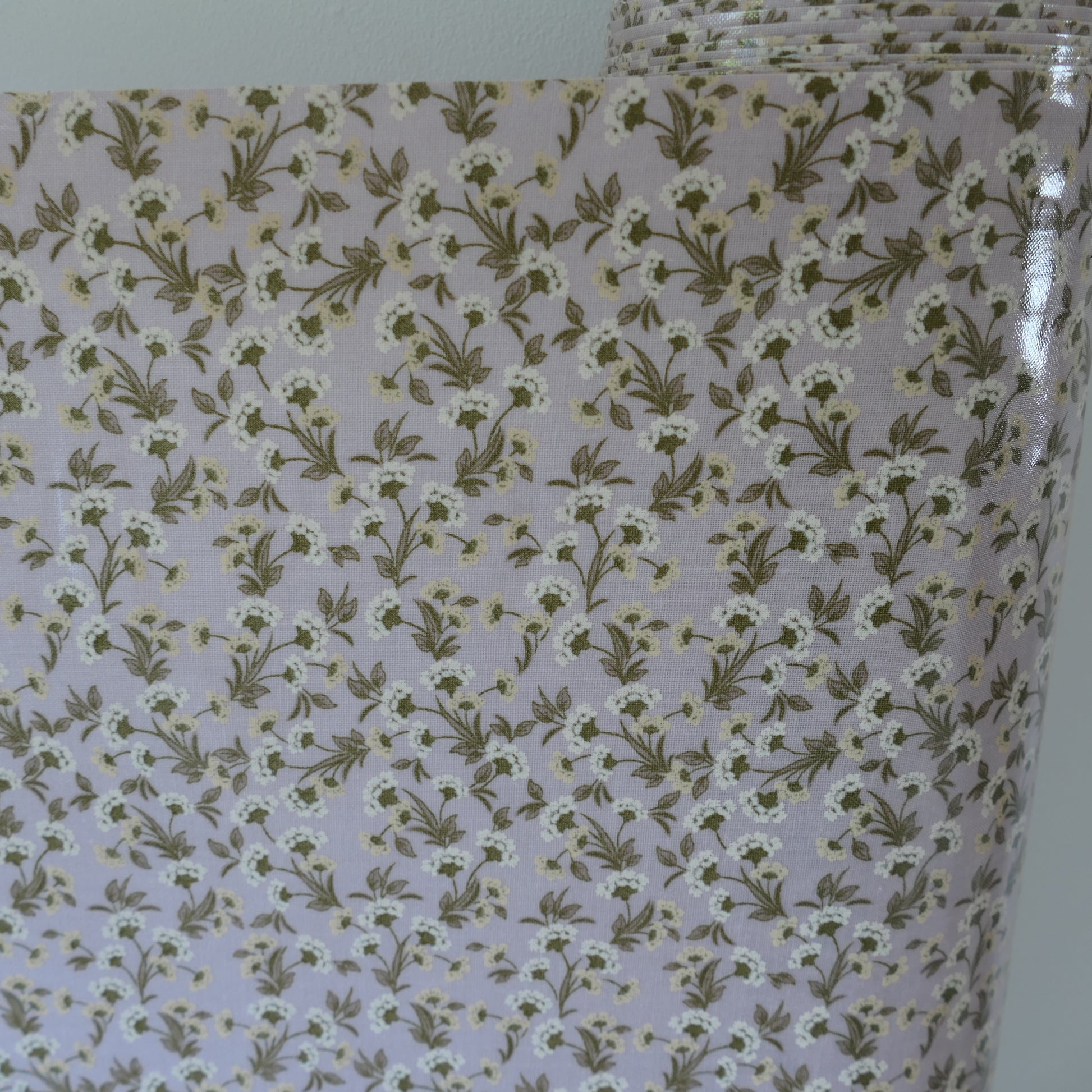 Pflegeleichtes Wachstuch mit filigranem Blumenmuster. Der Hintergrund ist hell lila / altrosa, die Blumen sind cremeweiß und die Stängel oliv.