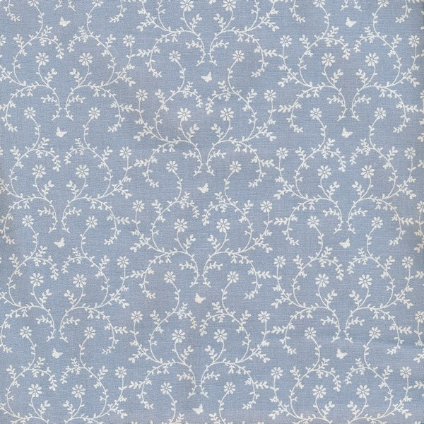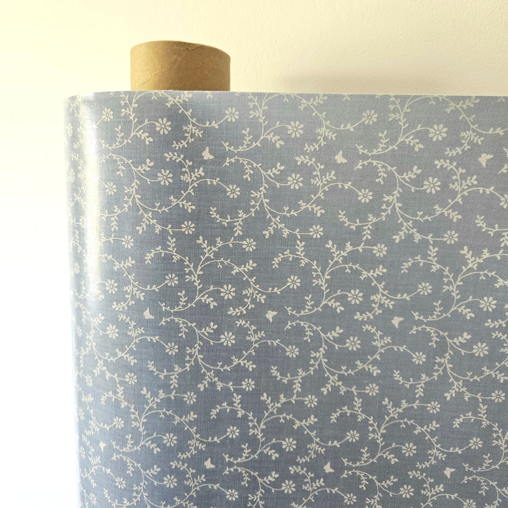 Pflegeleichtes Wachstuch mit filigranen Ranken und Blümchen. Der Hintergrund ist hellblau.