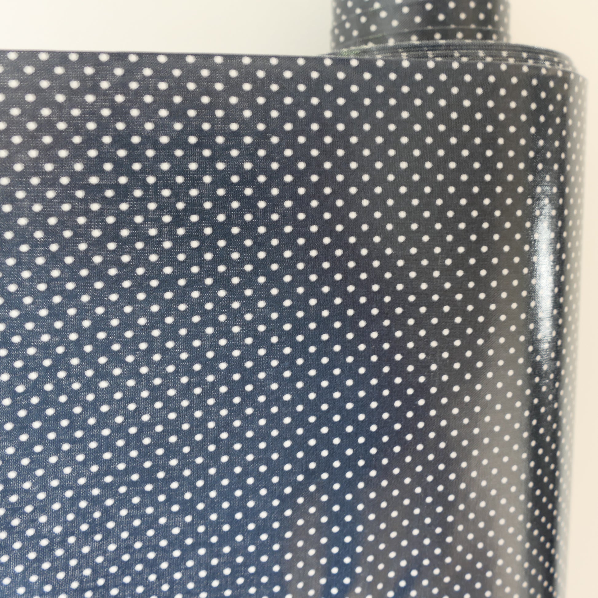 Pflegeleichtes Wachstuch mit kleinen Punkten, Pünktchen Größe ca. 2mm. Der Hintergrund ist dunkelblau.