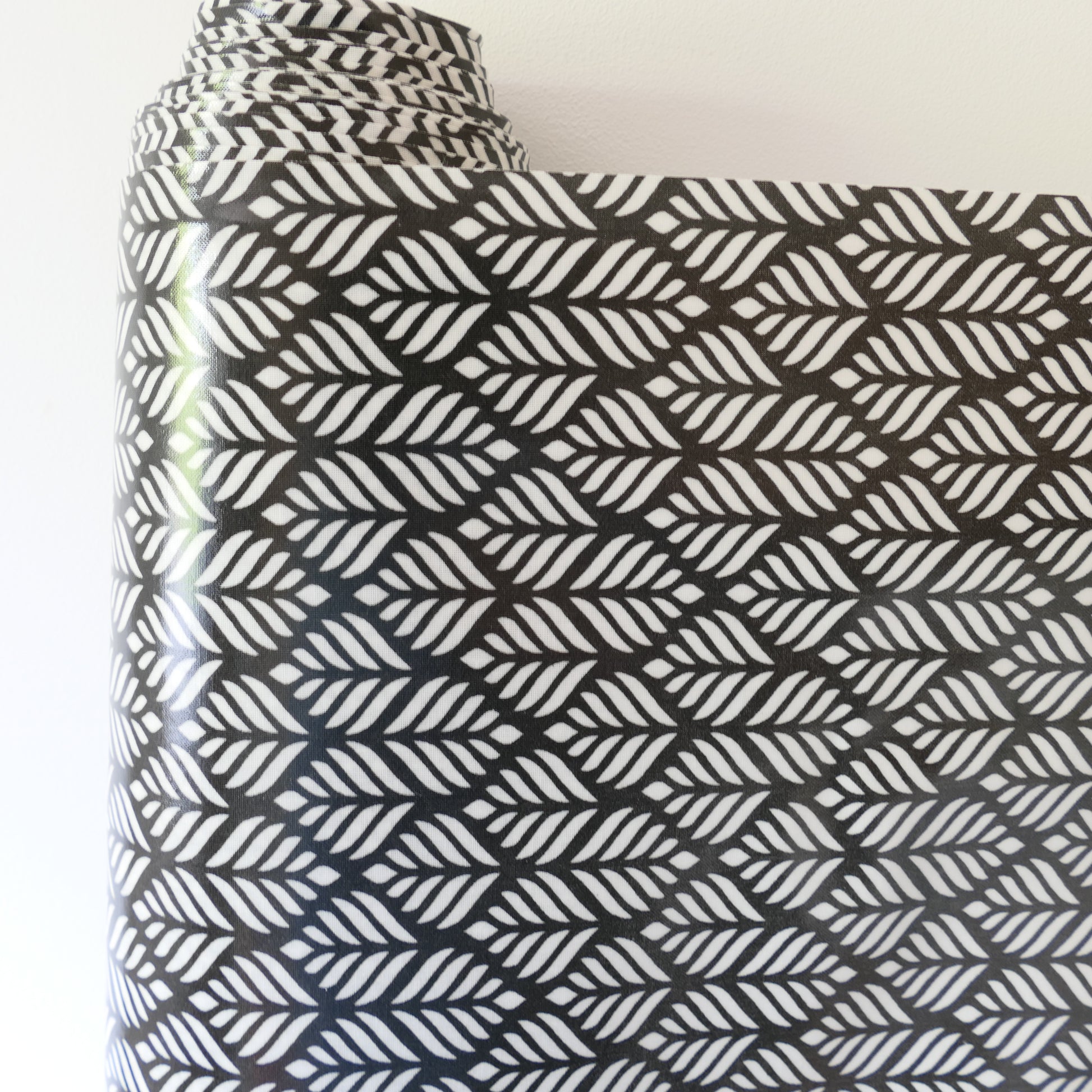 Pflegeleichtes Wachstuch mit Blättermotiv, ein Blatt ist etwa 3,5cm hoch, der Hintergrund ist kohlschwarz, die Blätter sind cremefarben / eierschalenweiß.