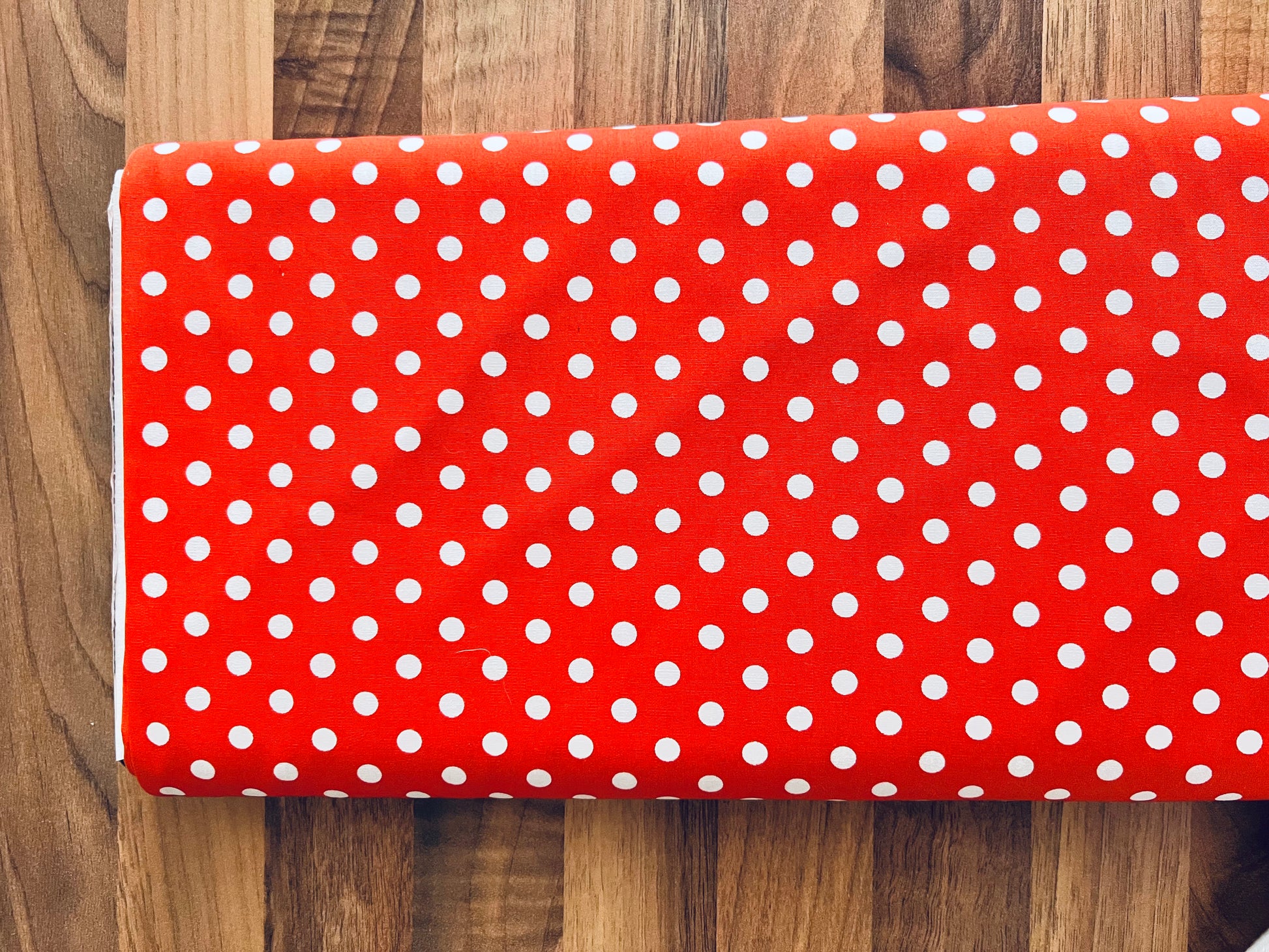 Dieser Baumwollstoff in Orange ist mit gleichmäßig verteilten weißen Punkten (ca. 7 mm) bedruckt und verleiht deinen Nähpojekten eine fröhliche, verspielte Note. Ideal für Taschen, Kissen, Deko und Patchwork Arbeiten.