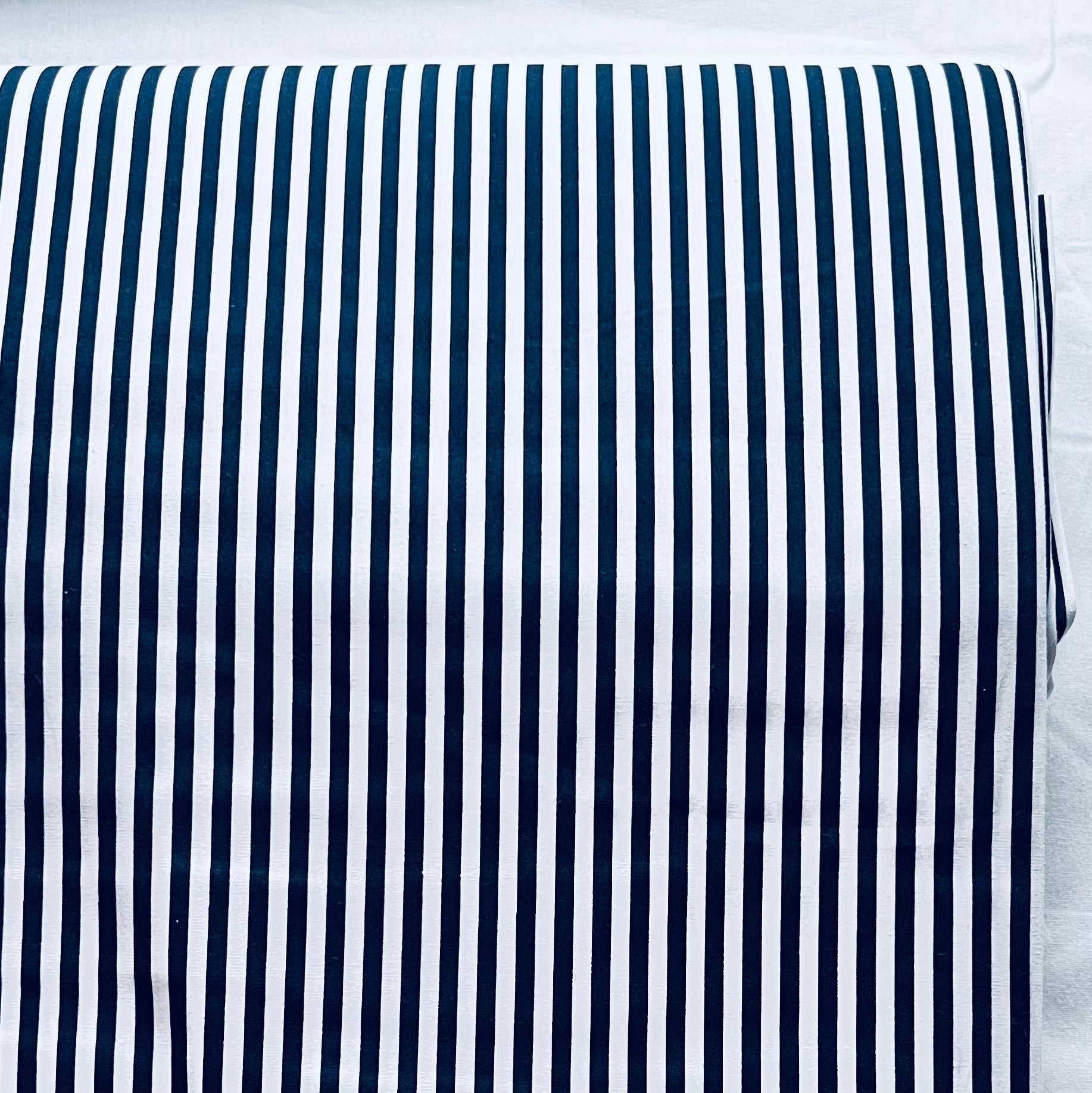Dieser dunkelblaue Baumwollstoff mit 5 mm breiten weißen Streifen überzeugt mit zeitloser Eleganz und maritimem Flair. Ideal für Taschen, Kissen, Kleidung, Wohntextilien, Patchwork oder Deko. Die gleichmäßigen Streifen sorgen für Struktur mit nordischem Charme.