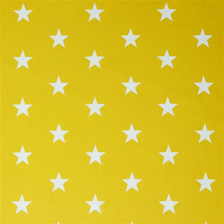 Dieser Baumwollstoff in sonnigem Gelb ist mit weißen Sternen (ca. 33 mm) bedruckt und sorgt für einen fröhlichen, klaren Look. Perfekt für Deko, Kissen, Taschen oder Kleidung mit Statement - einzeln oder als Kombistoff.