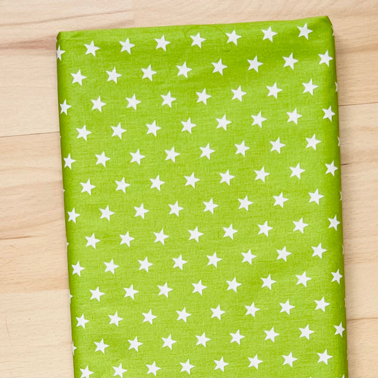 Dieser Baumwollstoff in zartem Hellgrün ist mit 10 mm kleinen Sternchen verziert - ein fröhliches Design für Groß und Klein. Ob für Kleidung, Accessoires, Deo oder Taschen - der klassische Sternenlook kombiniert mit der frischen Farbe sorgt für gute Laune und vielseitige Einsatzmöglichkeiten. Ideal auch als Kombistoff zu Unis, Karos und Streifen.