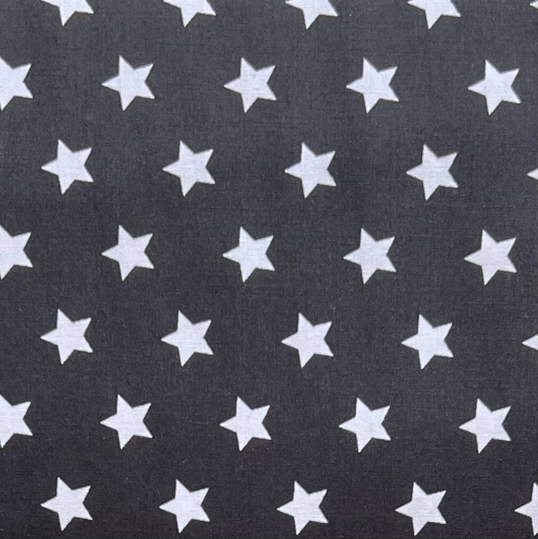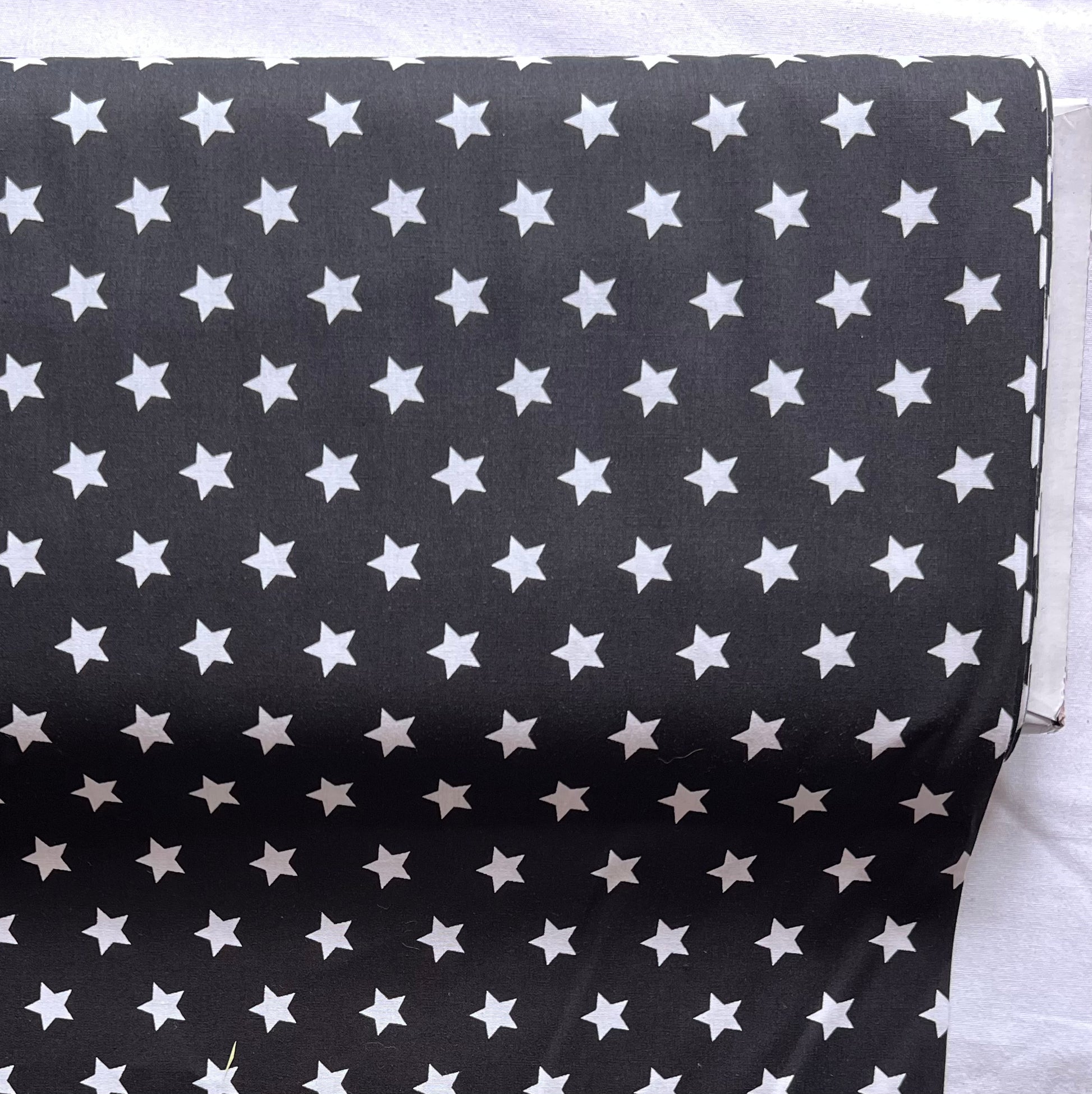 Dieser Baumwollstoff zeigt ein auffälliges Muster aus 15 mm großen weißen Sternen auf schwarzem Hintergrund. Der starke Kontrast sorgt für einen ausdrucksstarken Look - perfekt für Kleidung, Accessoires, Deko, Taschen oder festliche Nähideen. Die Sterne bringen Schwung und Fröhlichkeit in jedes Design.