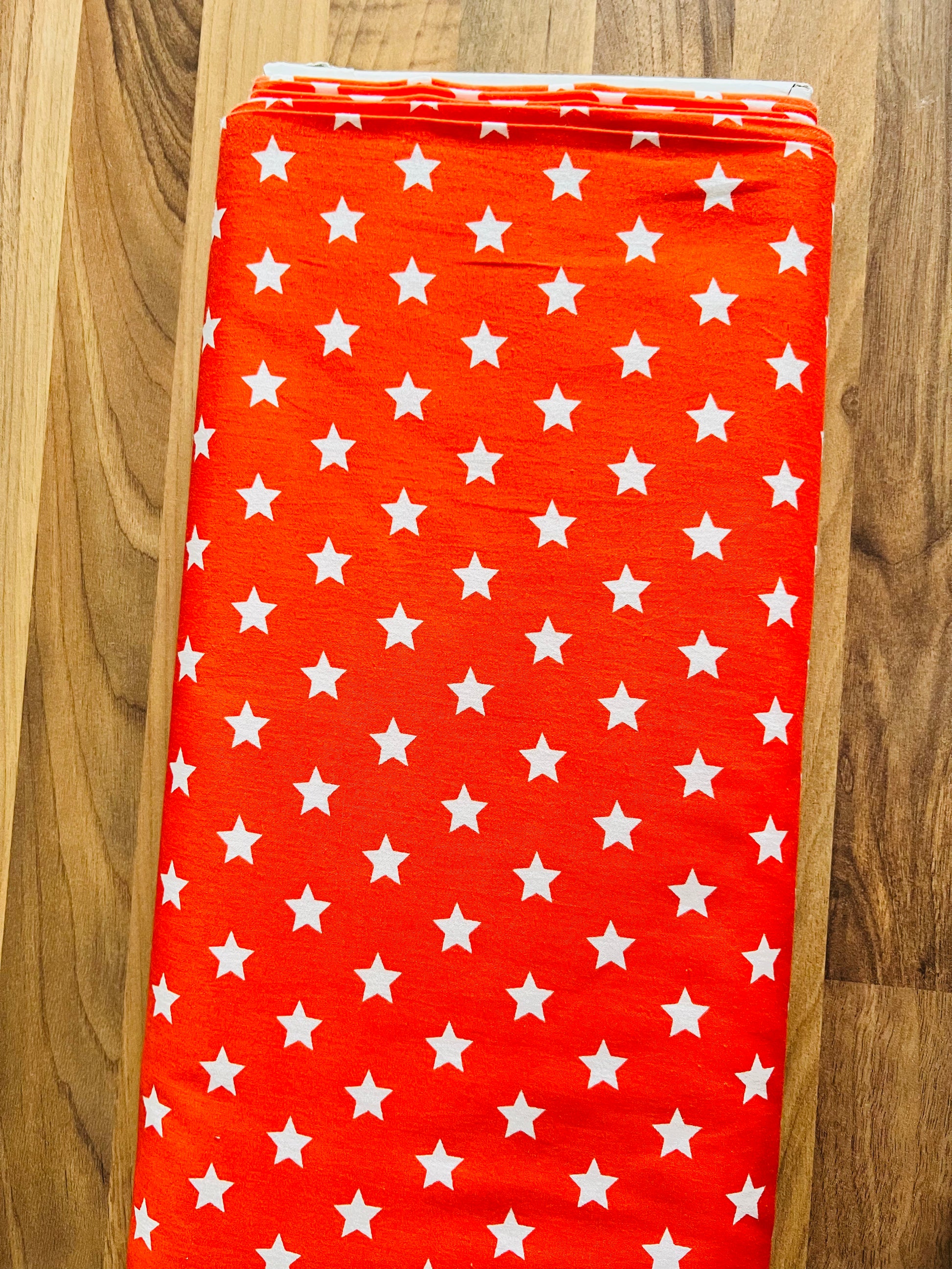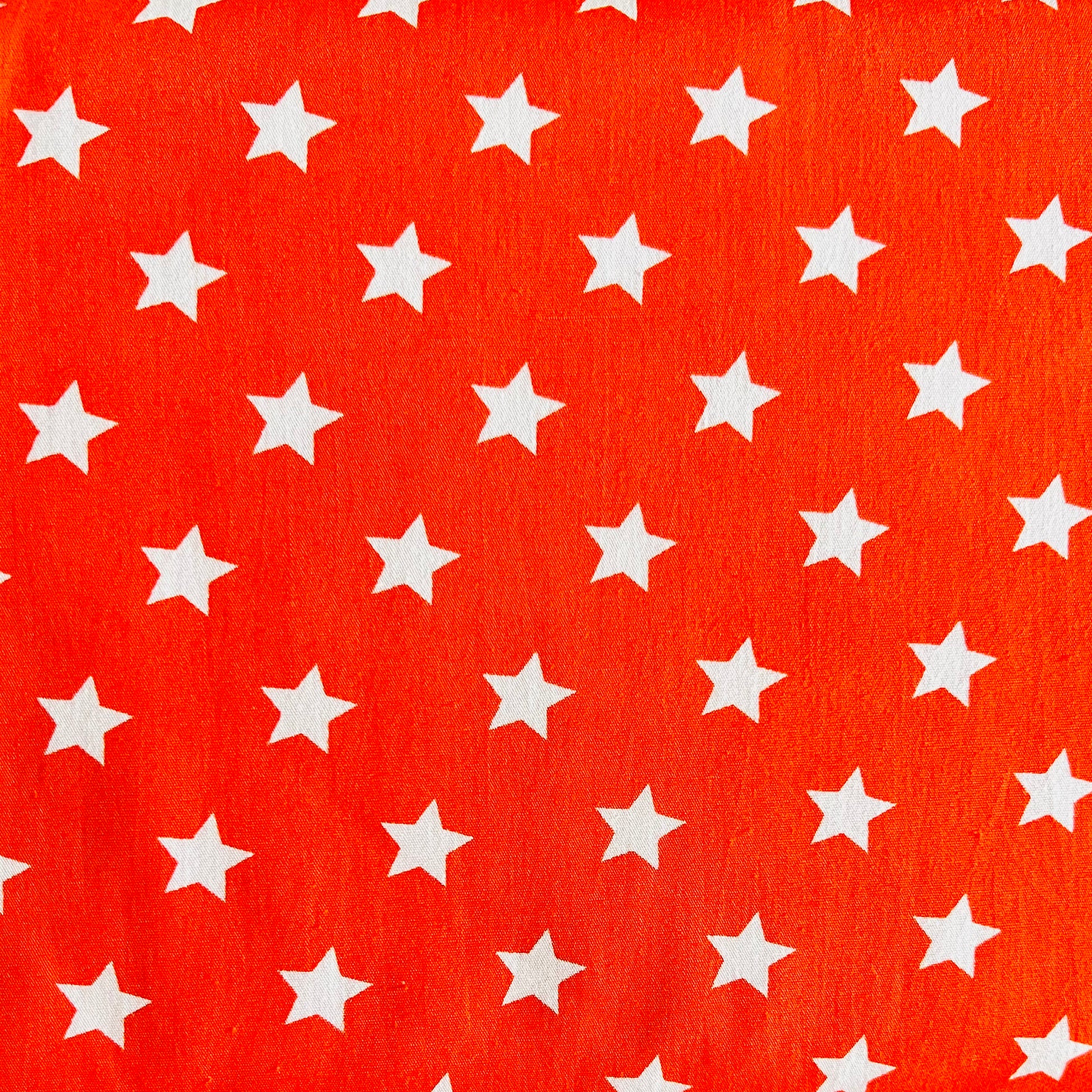 Dieser Baumwollstoff in kräftigem Orange ist mit weißen Sternen (ca. 15 mm) bedruckt und sorgt für einen fröhlichen, klaren Look. Perfekt für Deko, Kissen, Taschen oder Kleidung mit Statement - einzeln oder als Kombistoff.