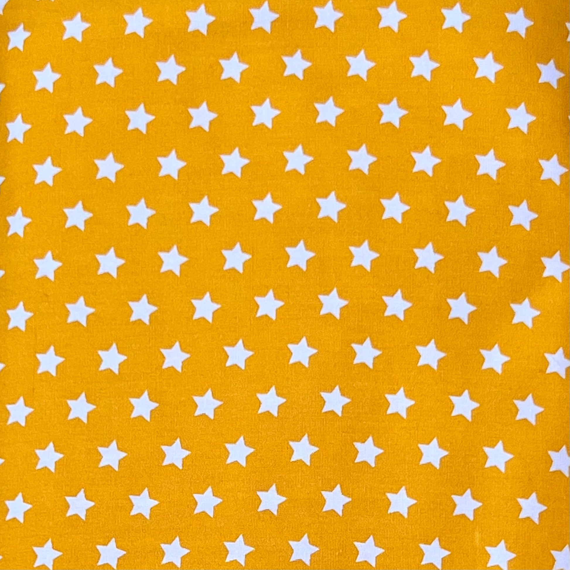 Dieser Baumwollstoff in sonnigem Gelb ist mit weißen Sternchen (ca. 10 mm) bedruckt und sorgt für einen fröhlichen, klaren Look. Perfekt für Deko, Kissen, Taschen oder Kleidung mit Statement - einzeln oder als Kombistoff.