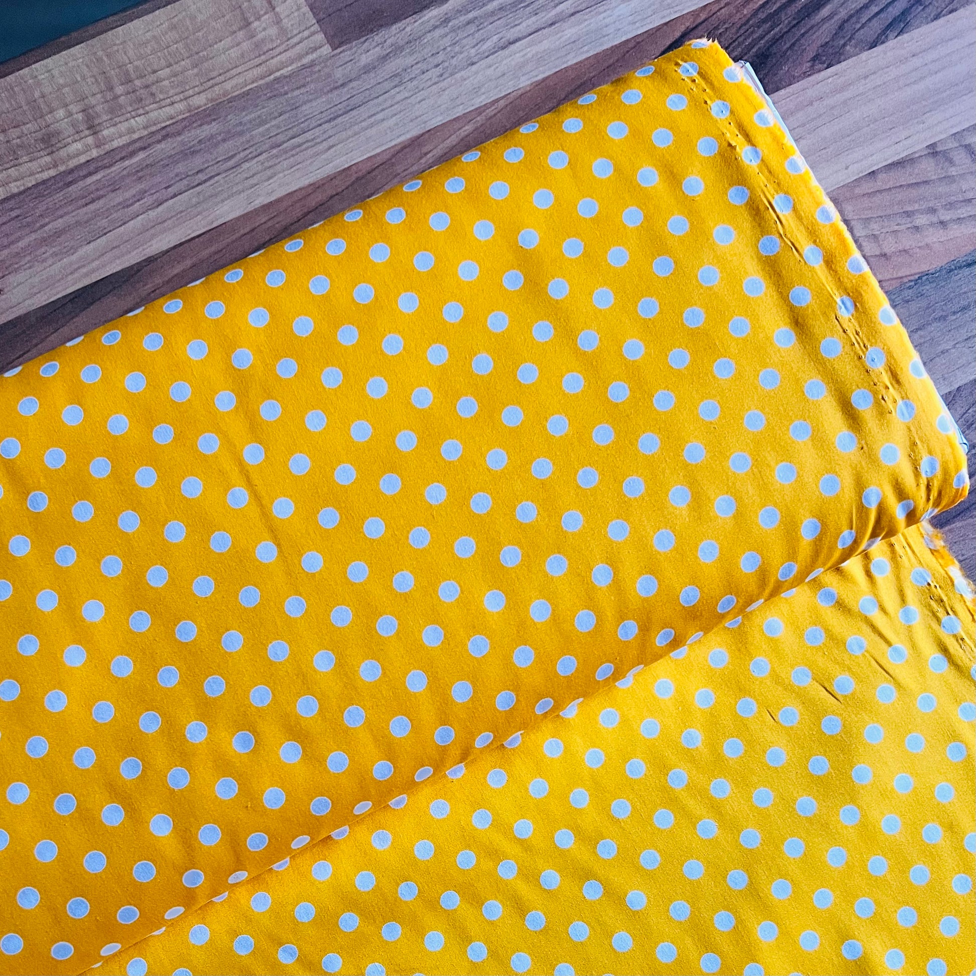 Dieser Baumwollstoff in Gelb ist mit gleichmäßig verteilten weißen Punkten (ca. 7 mm) bedruckt und verleiht deinen Nähpojekten eine frische, fröhliche Note. Ideal für Taschen, Kissen, Deko und Patchwork Arbeiten.