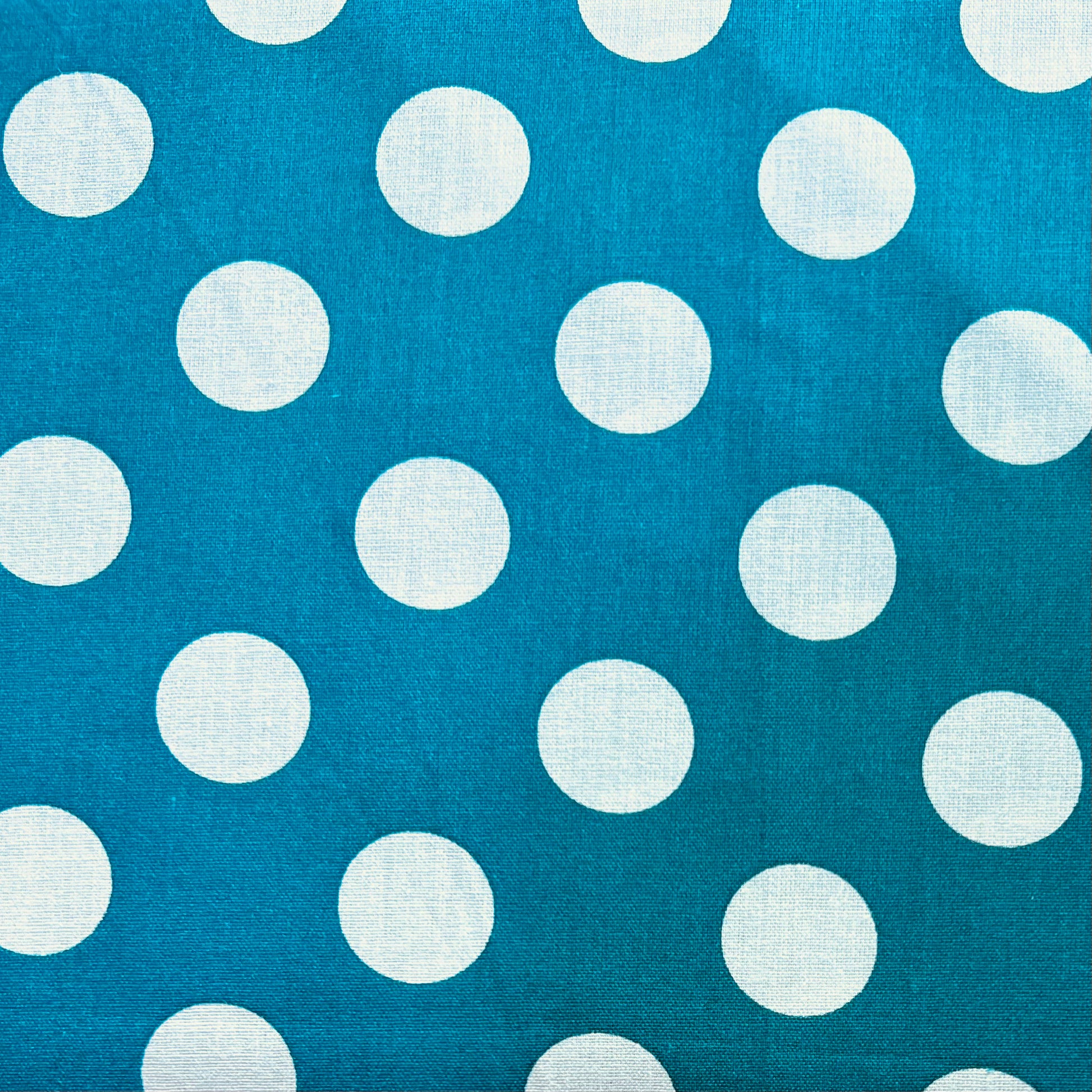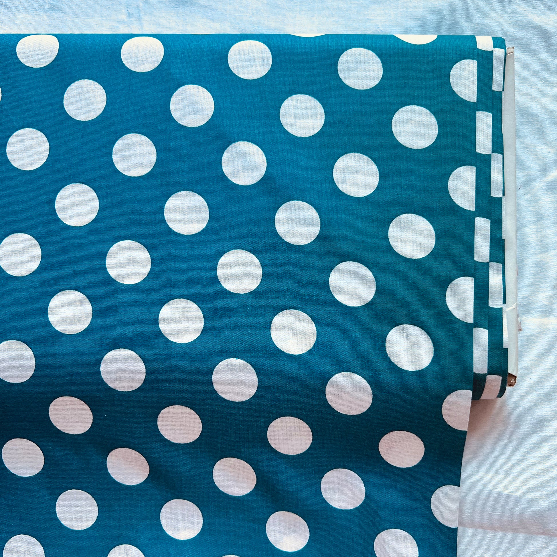 Ein ausdrucksstarker Stoff für starke Nähideen: Dieser petrolfarbene Baumwollstoff ist mit großen weißen Punkten bedruckt und sorgt sofort für gute Laune. Ideal für Kleidung, Accessoires, Patchwork, Taschen oder Deko - dieser Stoff ist ein echter Hingucker!