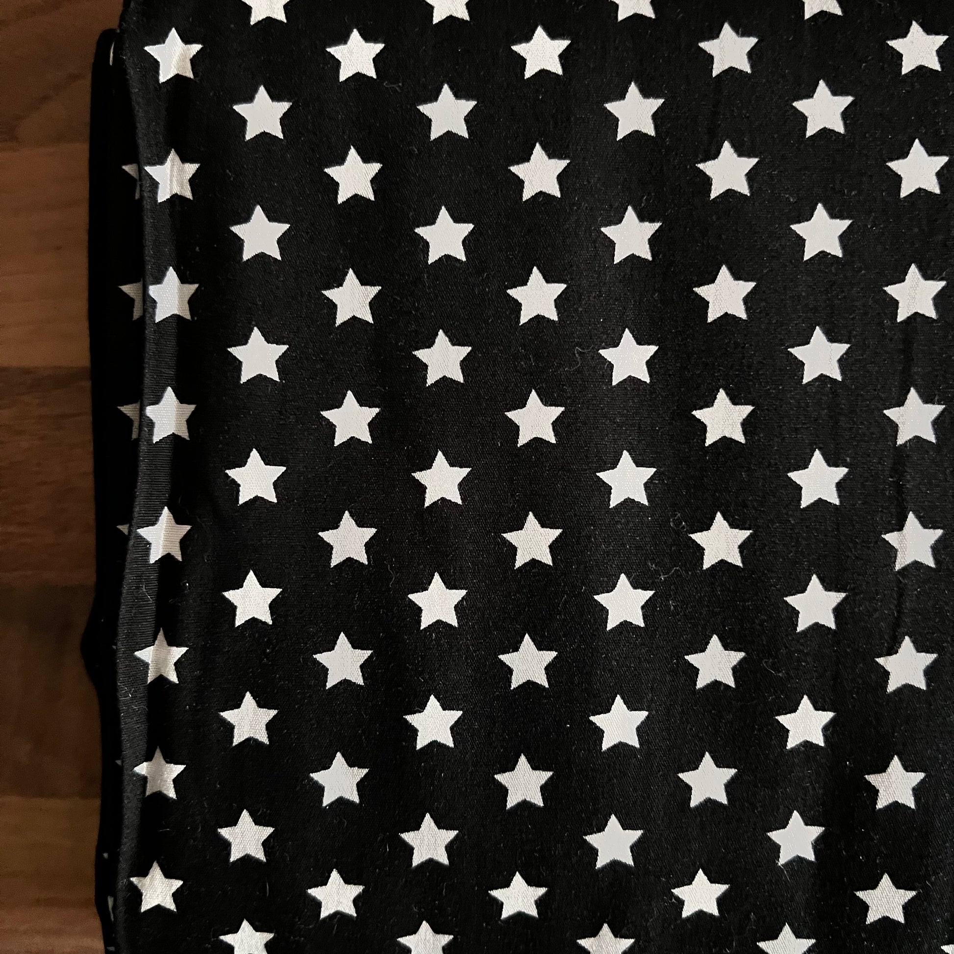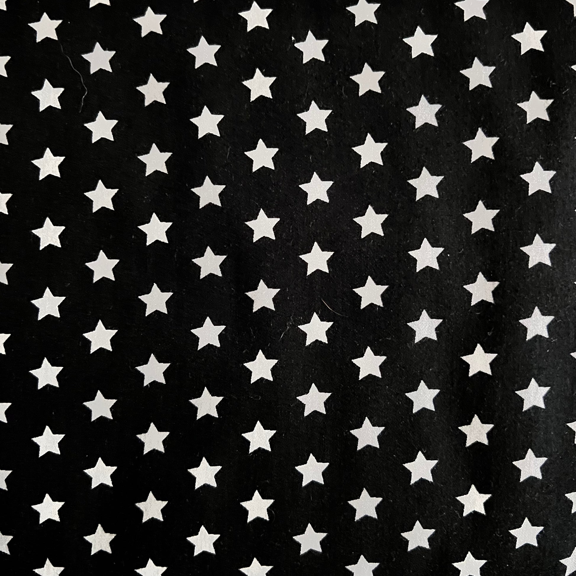 Dieser Baumwollstoff zeigt ein klares Muster aus 10 mm großen weißen Sternen auf schwarzem Hintergrund. Der starke Kontrast sorgt für einen ausdrucksstarken Look - perfekt für Kleidung, Accessoires, Deko, Taschen oder festliche Nähideen. Die Sterne wirken markant aber nicht aufdringlich.