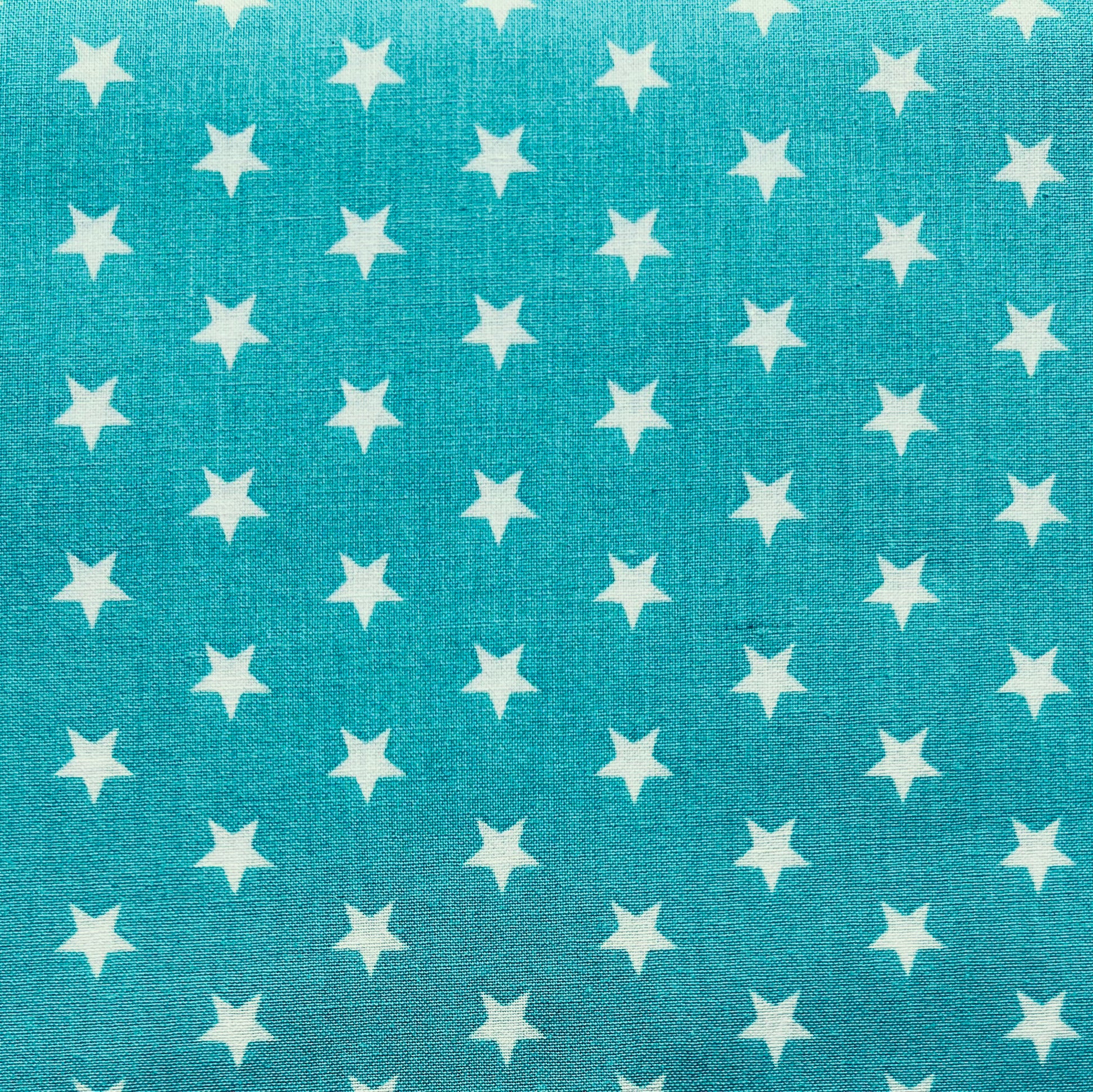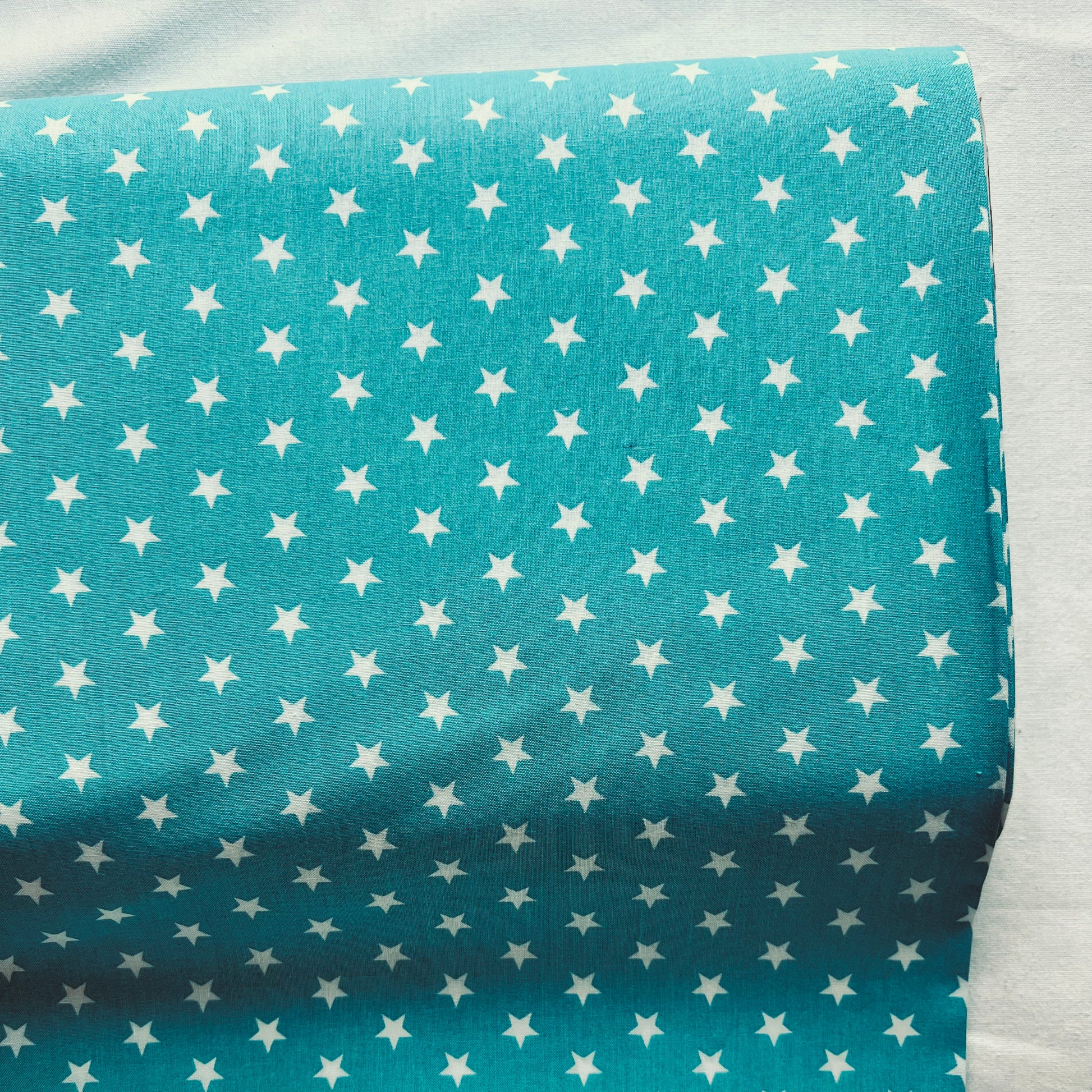 Ein echter Hingucker: Der minttürkise Baumwollstoff mit weißen 10 mm großen Sternen bringt gute Laune in jedes Projekt. Perfekt für Accessoires, Kleidung, Patchwork, Taschen, Heimtextilien oder Deko. Ein frischer, verspielter Stoff mit einem Hauch Sternenzauber.