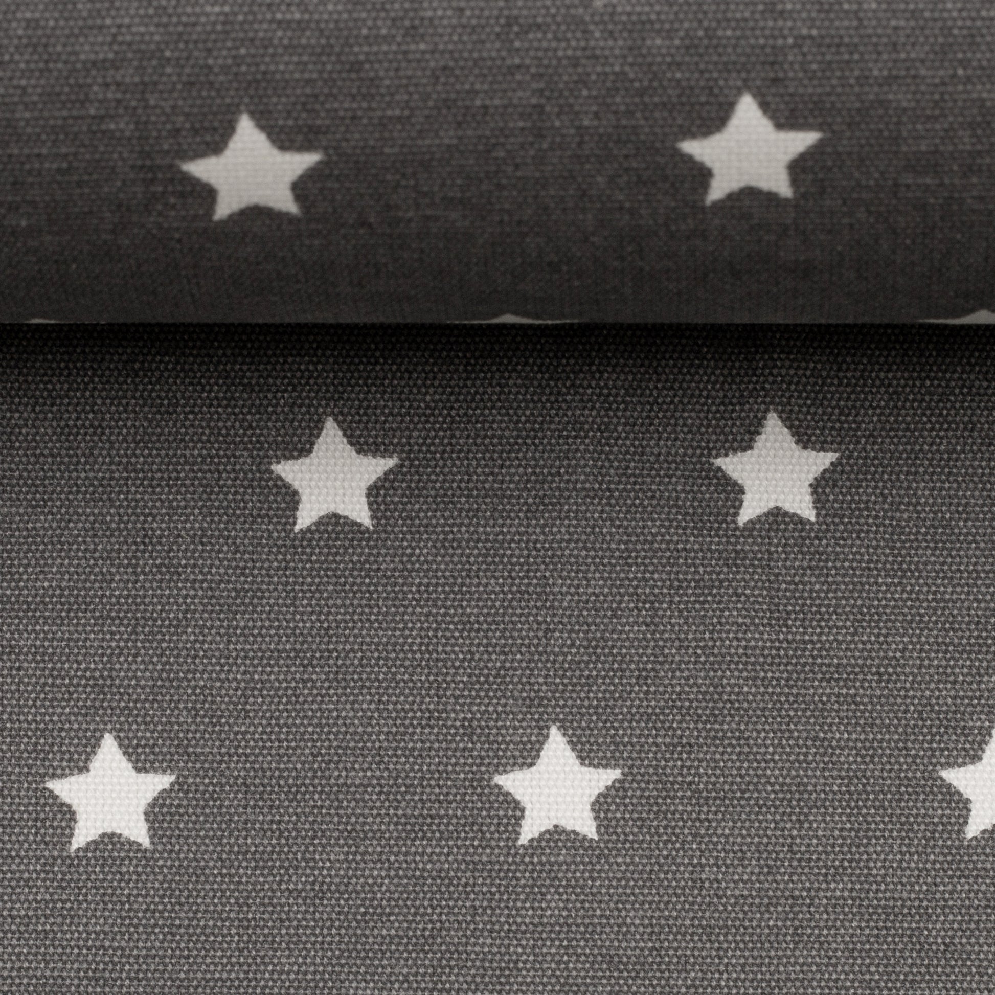 Pflegeleichte beschichtete Baumwolle mit kleinen ca. 1cm großen weißen Sternen. Der Hintergrund ist anthrazit / dunkelgrau.