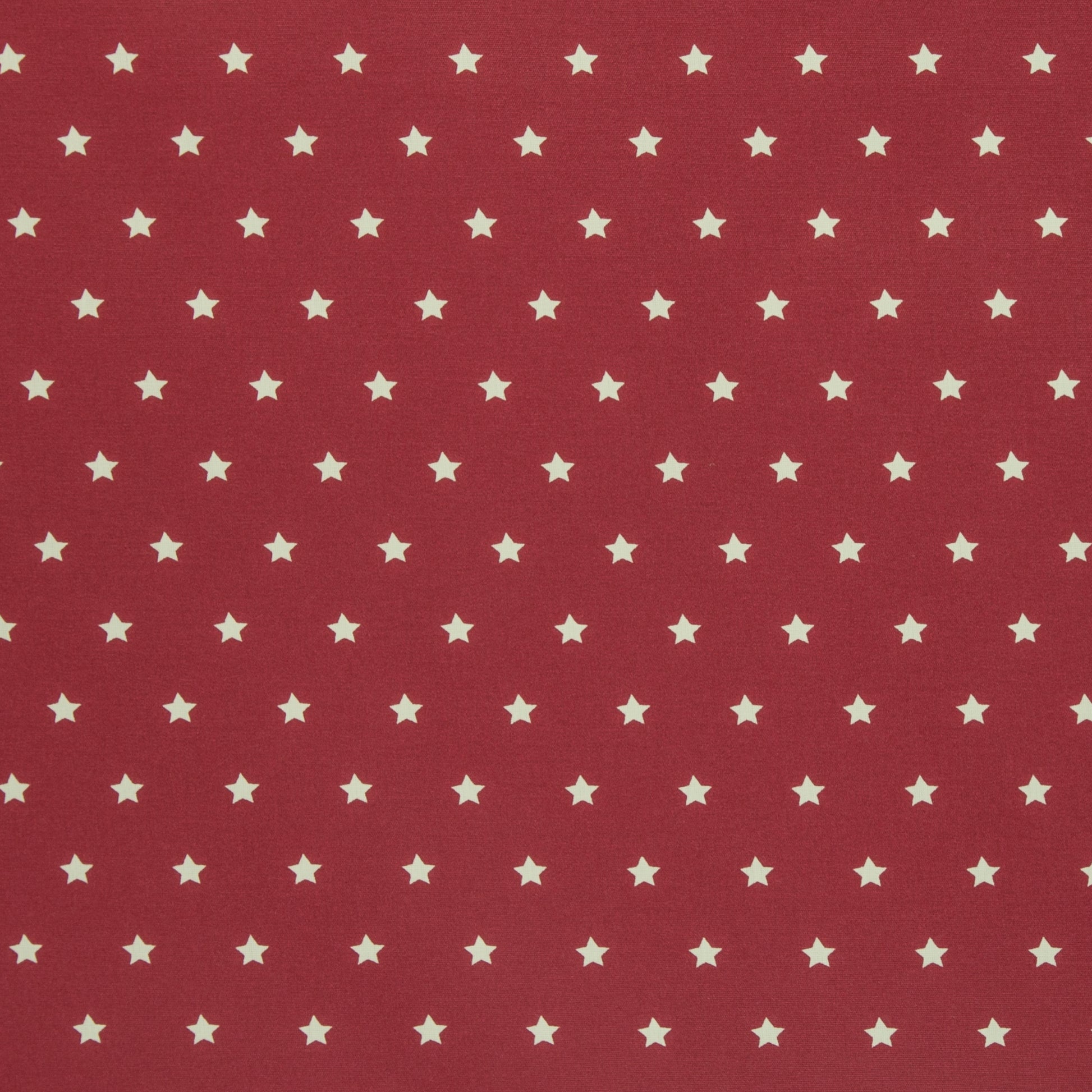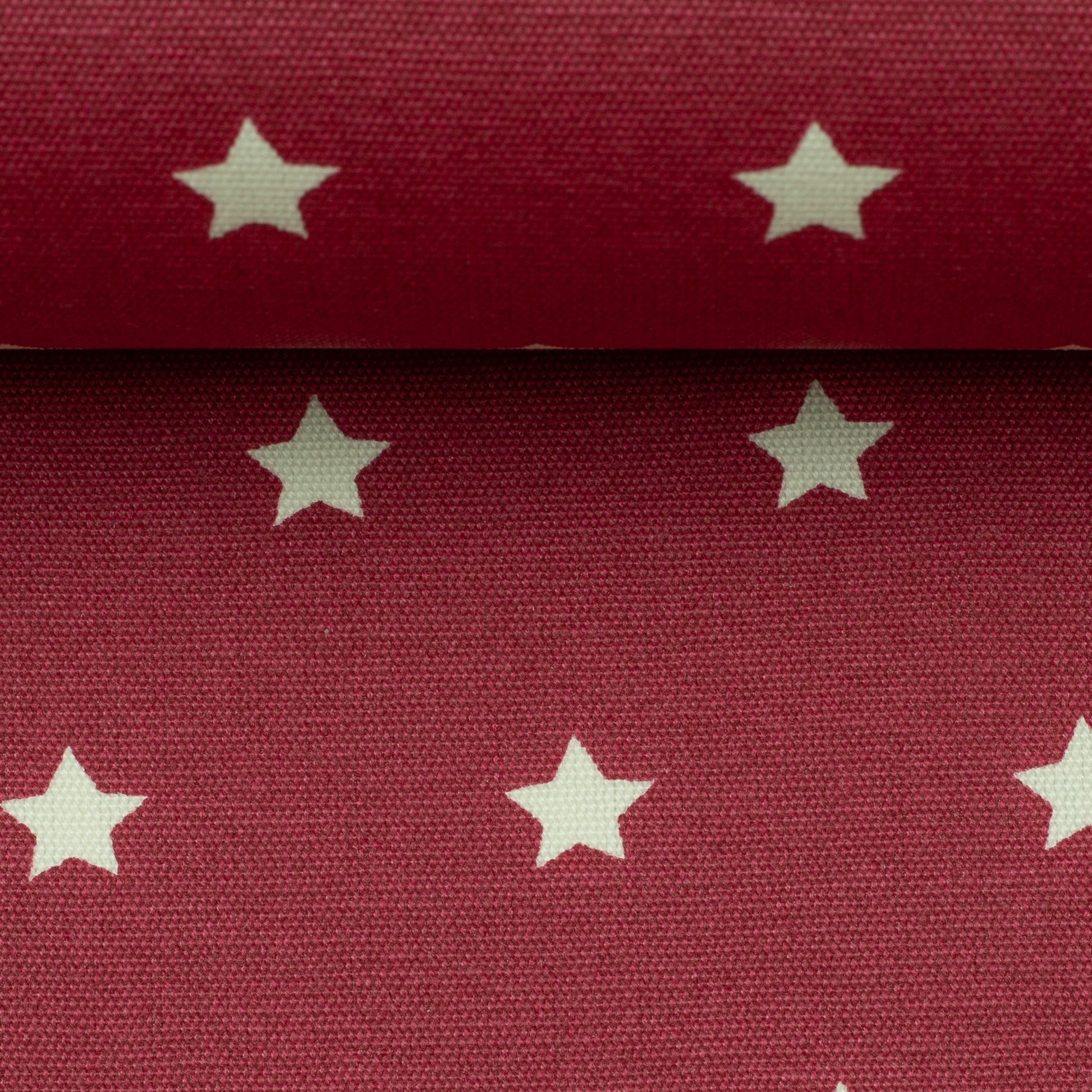 Pflegeleichte beschichtete Baumwolle mit kleinen ca. 1cm großen weißen Sternen. Der Hintergrund ist brombeere.