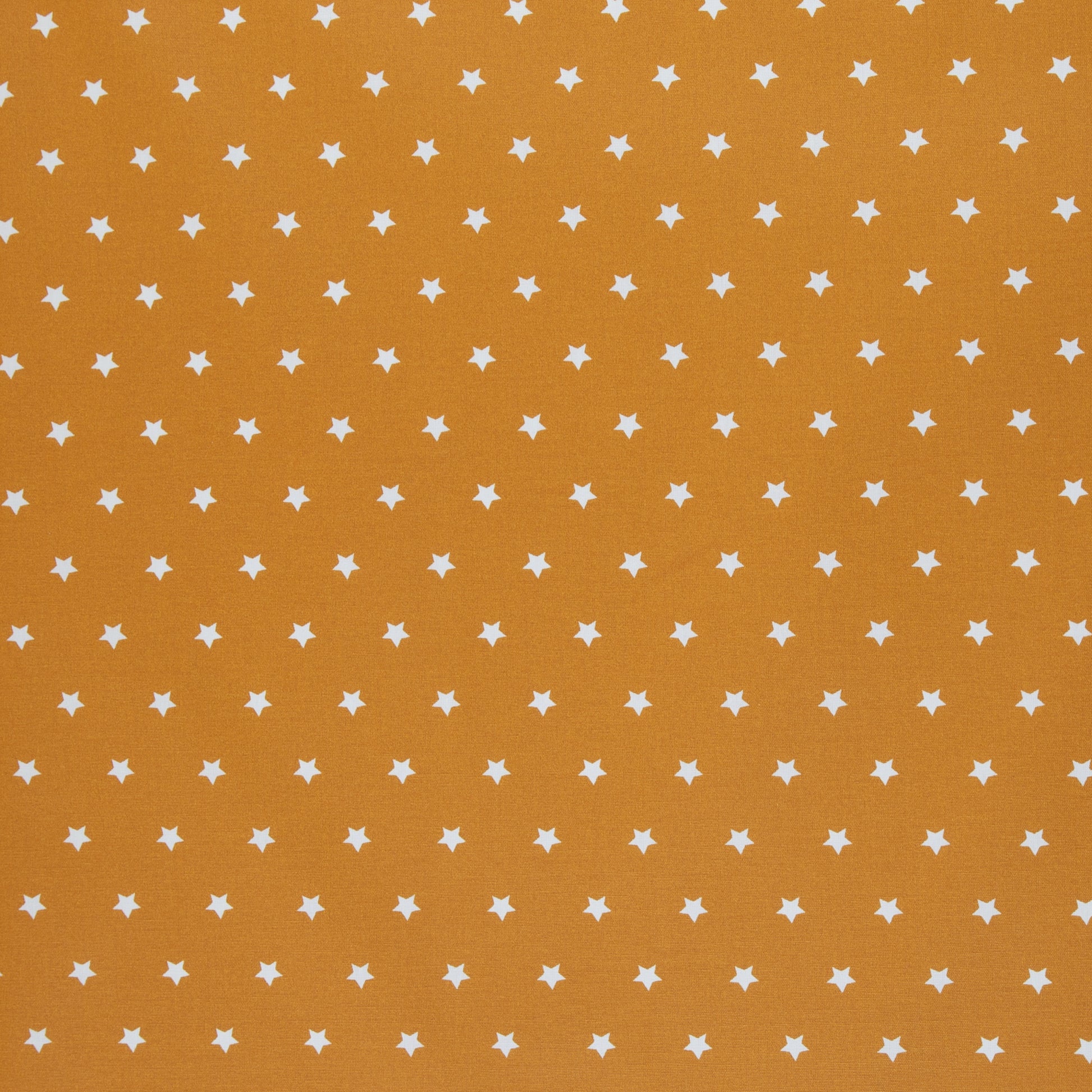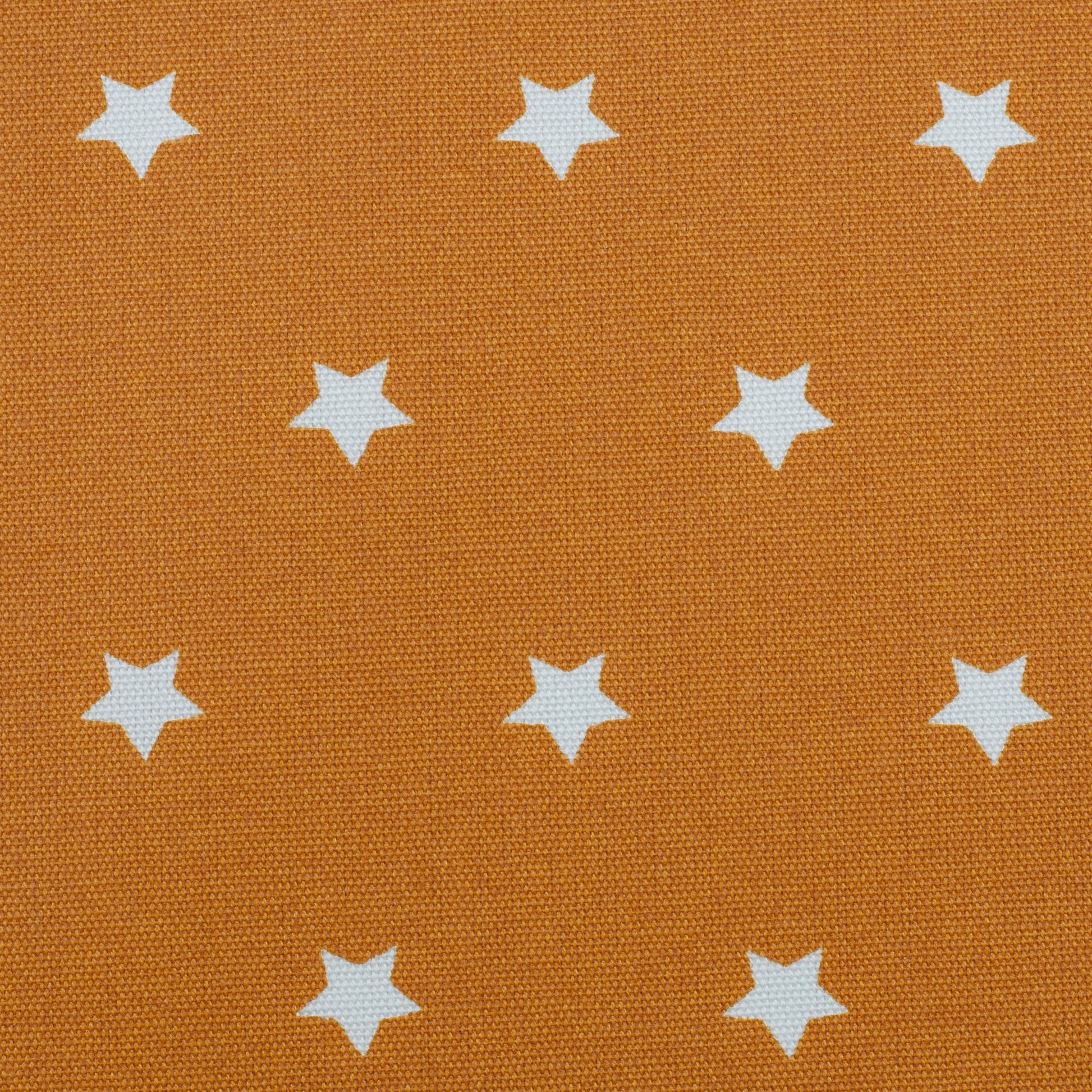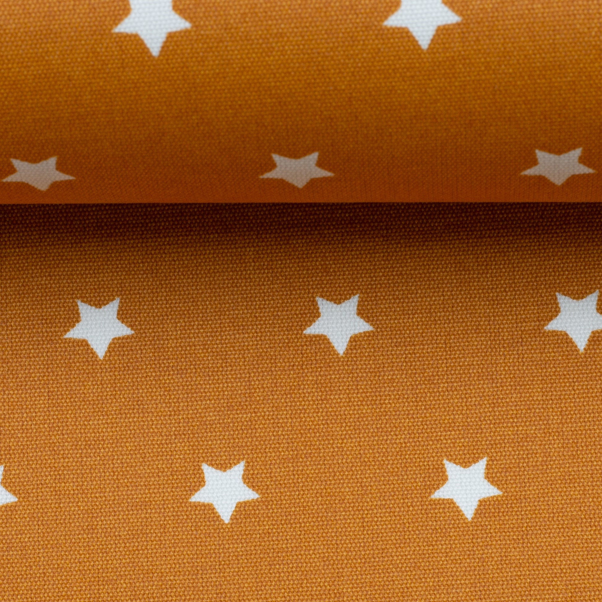 Pflegeleichte beschichtete Baumwolle mit kleinen ca. 1cm großen weißen Sternen. Der Hintergrund ist orange.