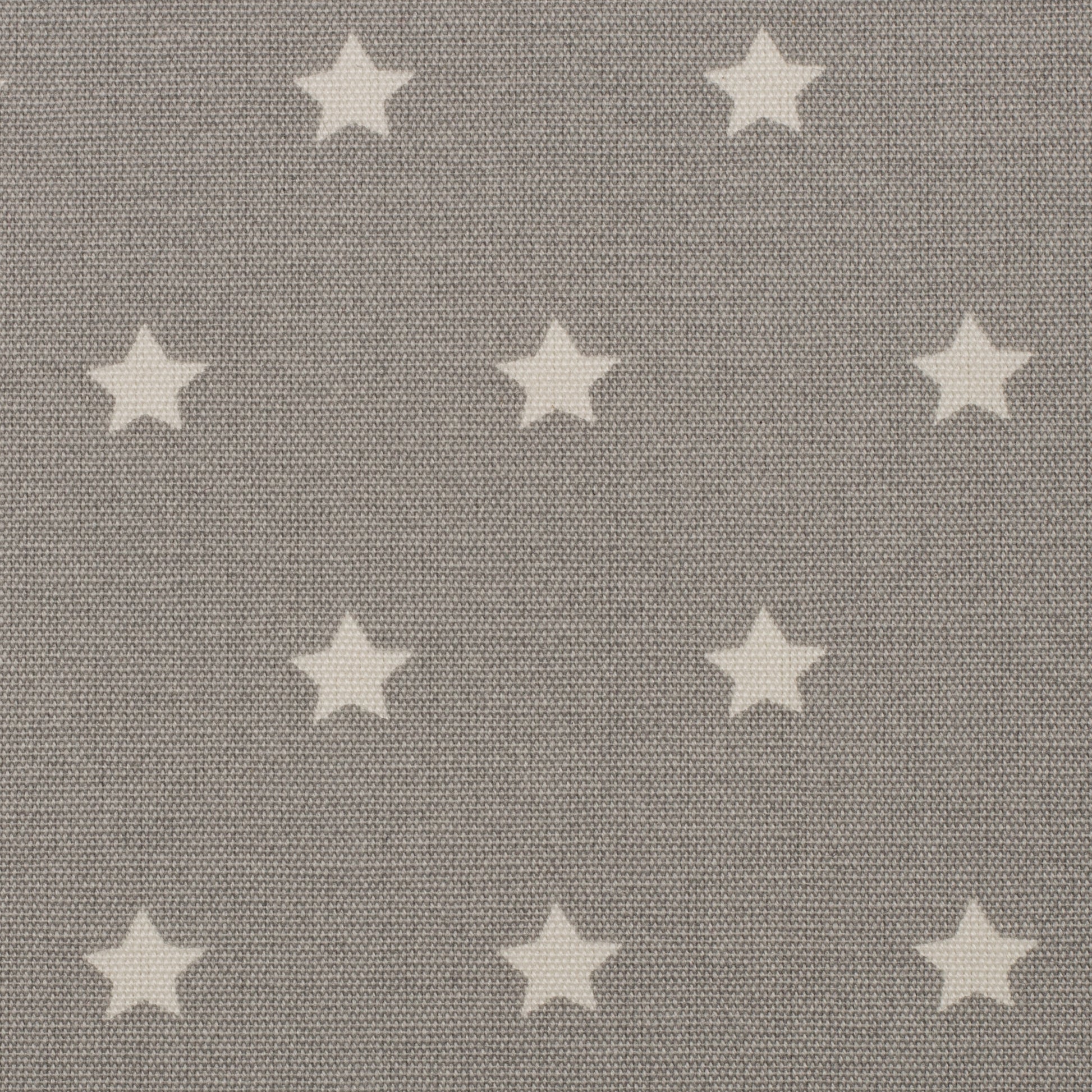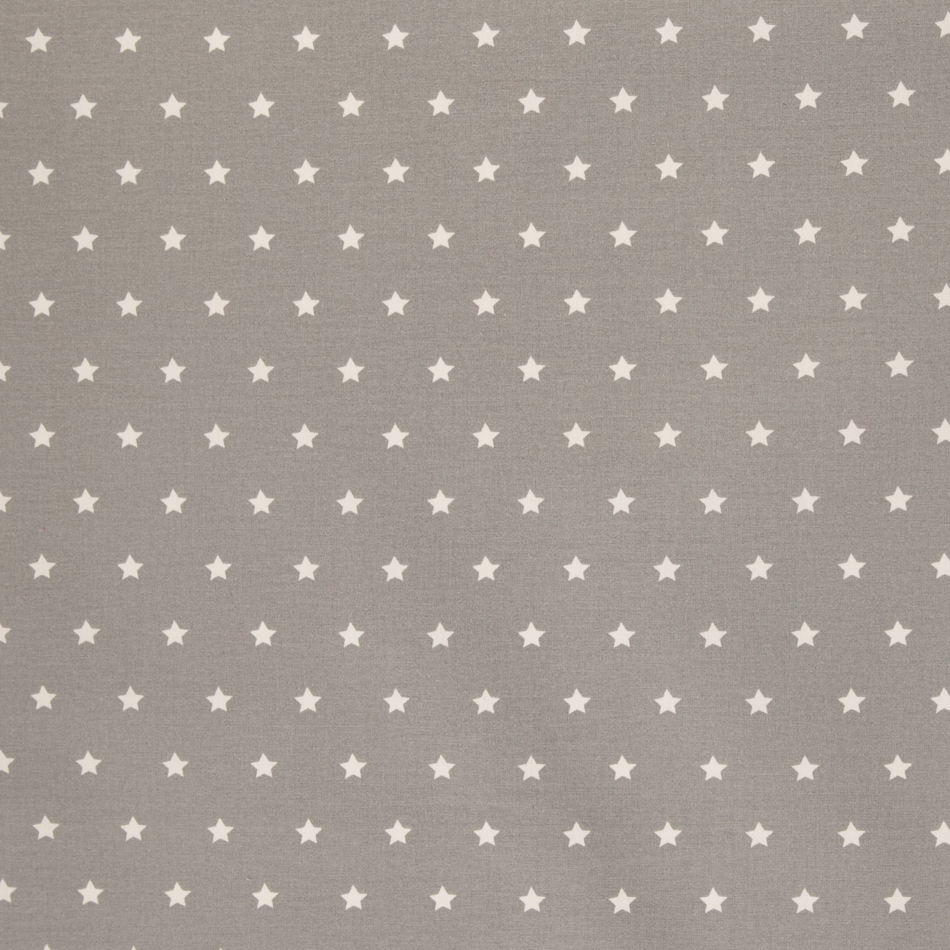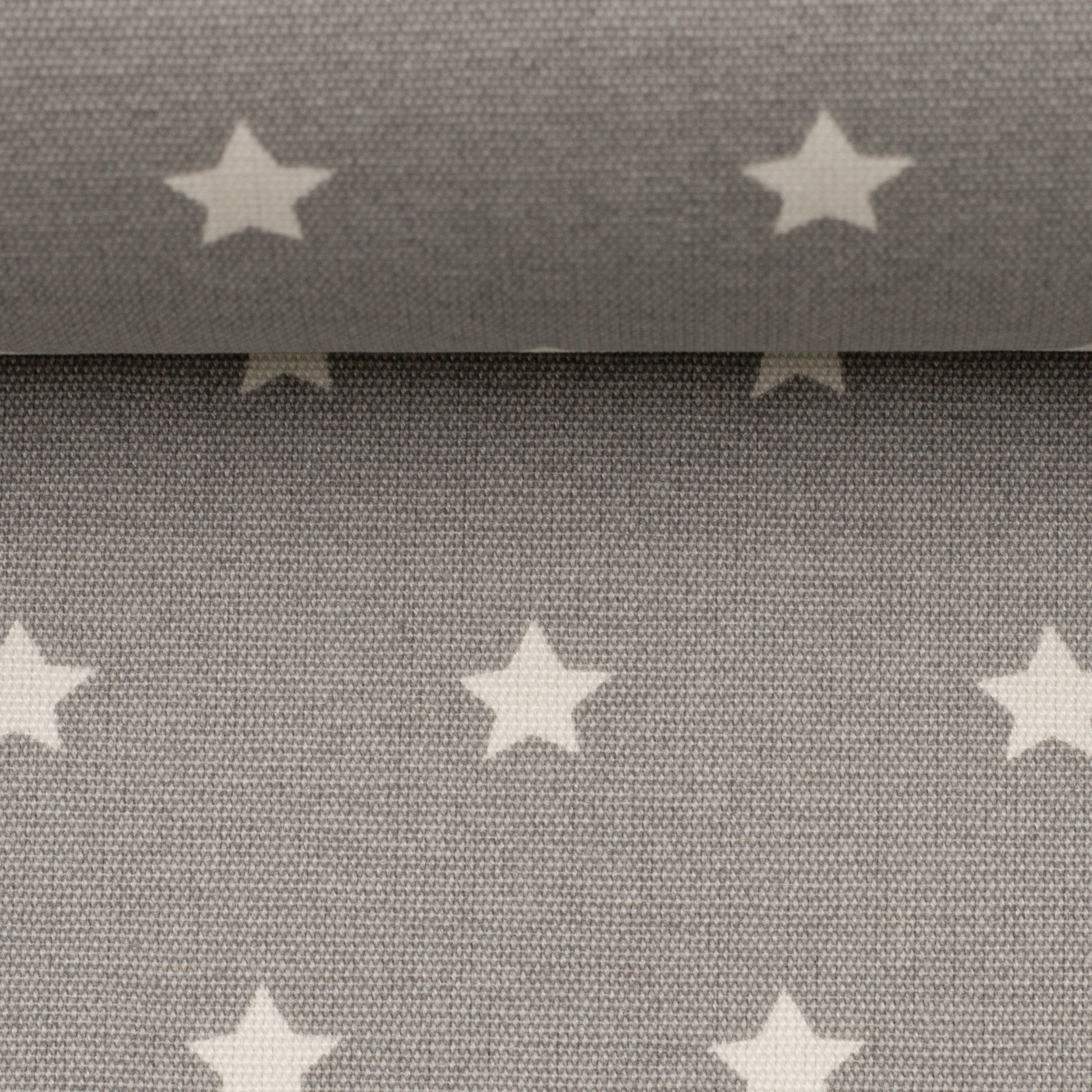 Pflegeleichte beschichtete Baumwolle mit kleinen ca. 1cm großen weißen Sternen. Der Hintergrund ist hellgrau.
