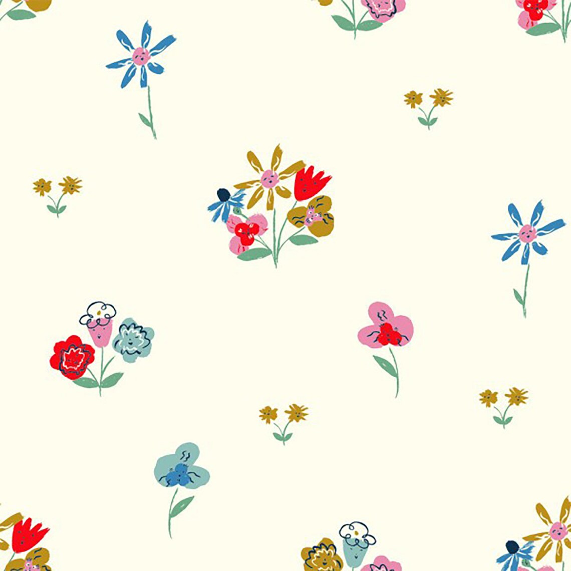 Birch Fabrics Biobaumwollstoff Wonderland GOLDEN AFTERNOON Blumenstoff Cremeweiß Rot Hellblau Gelb Grün
