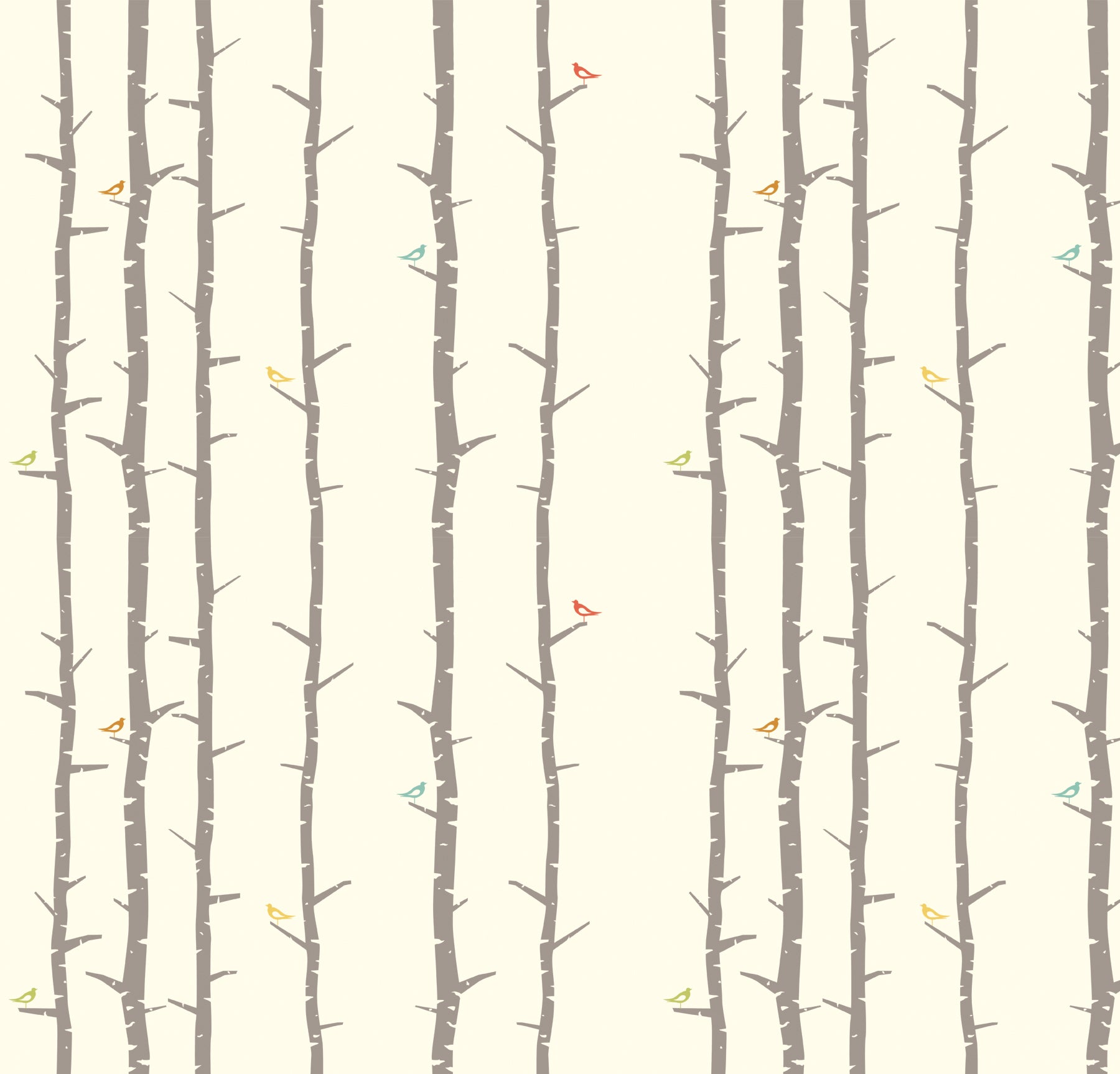 Birch Fabrics Biobaumwolle PERCH Natur-Look Bunte Vögel auf naturfarbenen Bäumen Cremeweißer Hintergrund