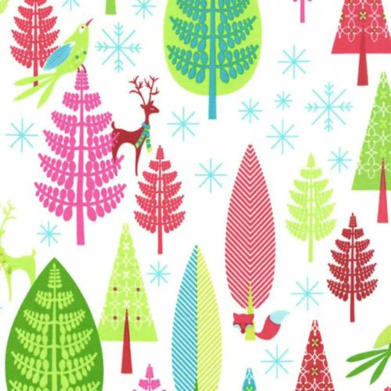 Der Baumwollstoff Winter Woods Garland von Michael Miller bringt fröhlichen Weihnachtszauber in deine Nähprojekte! Auf einem weißen Hintergrund tummeln sich bunte Tannenbäume in Grün, Rot und Pink, begleitet von kleinen Füchsen, Hirschen, Vögeln und türkisfarbenen Schneeflocken. Das frische, verspielte Design eignet sich perfekt für weihnachtliche Deko, Patchwork, Geschenksäckchen oder festliche Kinderkleidung.
