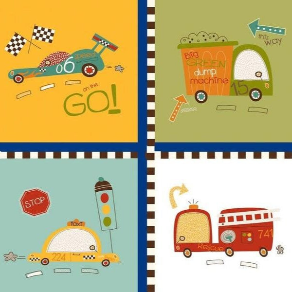 Der Stoff On Our Way – Cars von Riley Blake bringt Bewegung ins Kinderzimmer! Das Design zeigt vier beliebte Fahrzeugtypen – Rennwagen, Müllabfuhr, Taxi und Feuerwehr – jeweils in einem von Rennstrecken-Design eingefassten Quadrat. Die quadratischen Motive (8 pro Reihe) reihen sich harmonisch aneinander und wiederholen sich über die gesamte Stoffbreite – ideal für Patchwork, Kinderbekleidung, Kissen oder Applikationen.