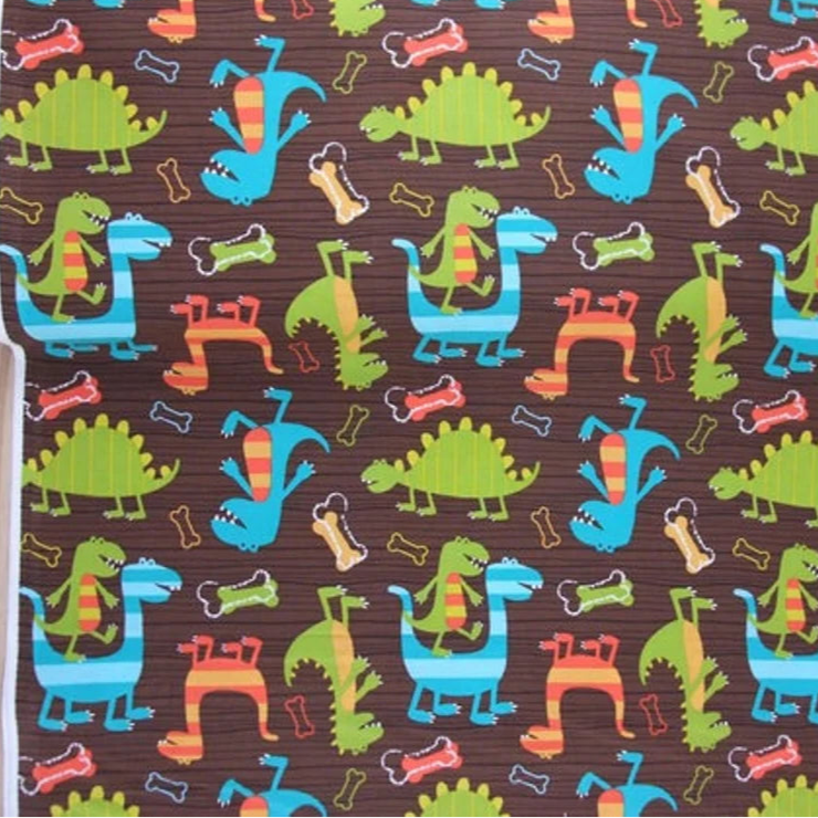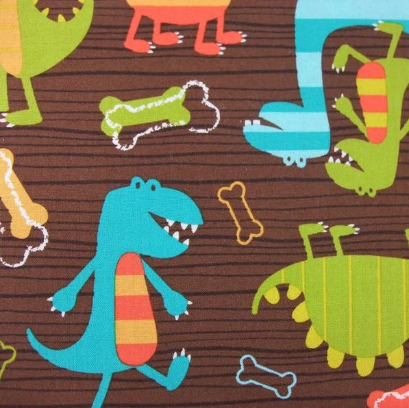 Der Dino Dudes Baumwollstoff von Michael Miller ist ein echter Hingucker für kleine Dino-Fans! Auf einem warmen holzbraunen Hintergrund tummeln sich fröhliche Dinosaurier in Grün, Türkis und Orange mit gelben Akzenten. Kleine bunte Knochen sorgen für zusätzlichen Charme. Ideal für Kinderkleidung, Kissen, Taschen oder fantasievolle Deko-Projekte.