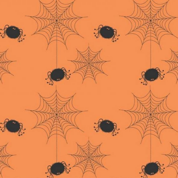 Riley Blake Baumwollstoff HOLIDAY BANNERS ORANGE Halloweenstoff mit Spinnen und Spinnennetze