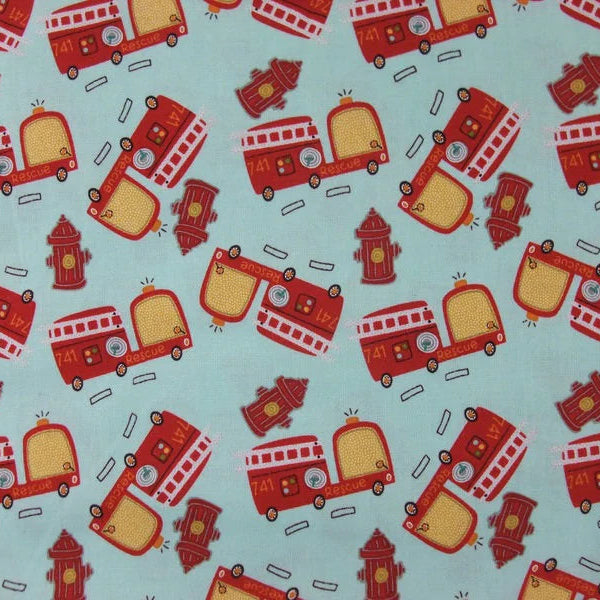 Der On Our Way Fire Truck Stoff von Riley Blake ist ein farbenfroher Allover-Print, der kleine Feuerwehrfans begeistert. Auf einem frischen hellblauen Hintergrund (Farbe: Teal) tummeln sich leuchtend rot-gelbe Feuerwehrautos und Hydranten – detailreich gestaltet und ideal für lebendige Kinderprojekte.