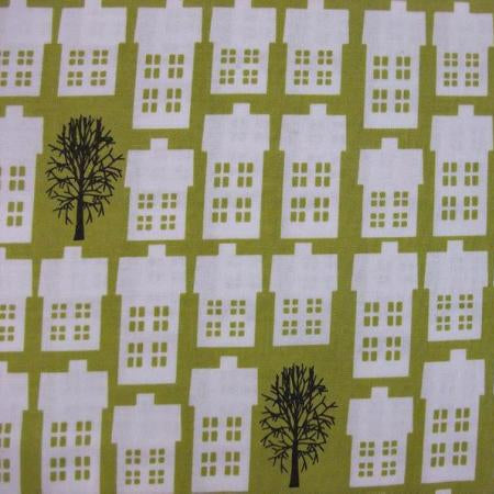 Copenhagen Print Factory Baumwollstoff VILLAGE GREEN – Skandinavisches Dorfidyll in Grün Häuser Bäume