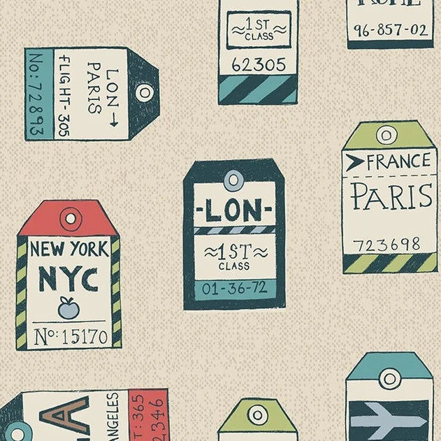 Fabric Freedom Baumwollstoff FX46 GLOBE TROTTER Globetrotter – Kofferanhänger & Reise-Motive auf sand beigem Grund