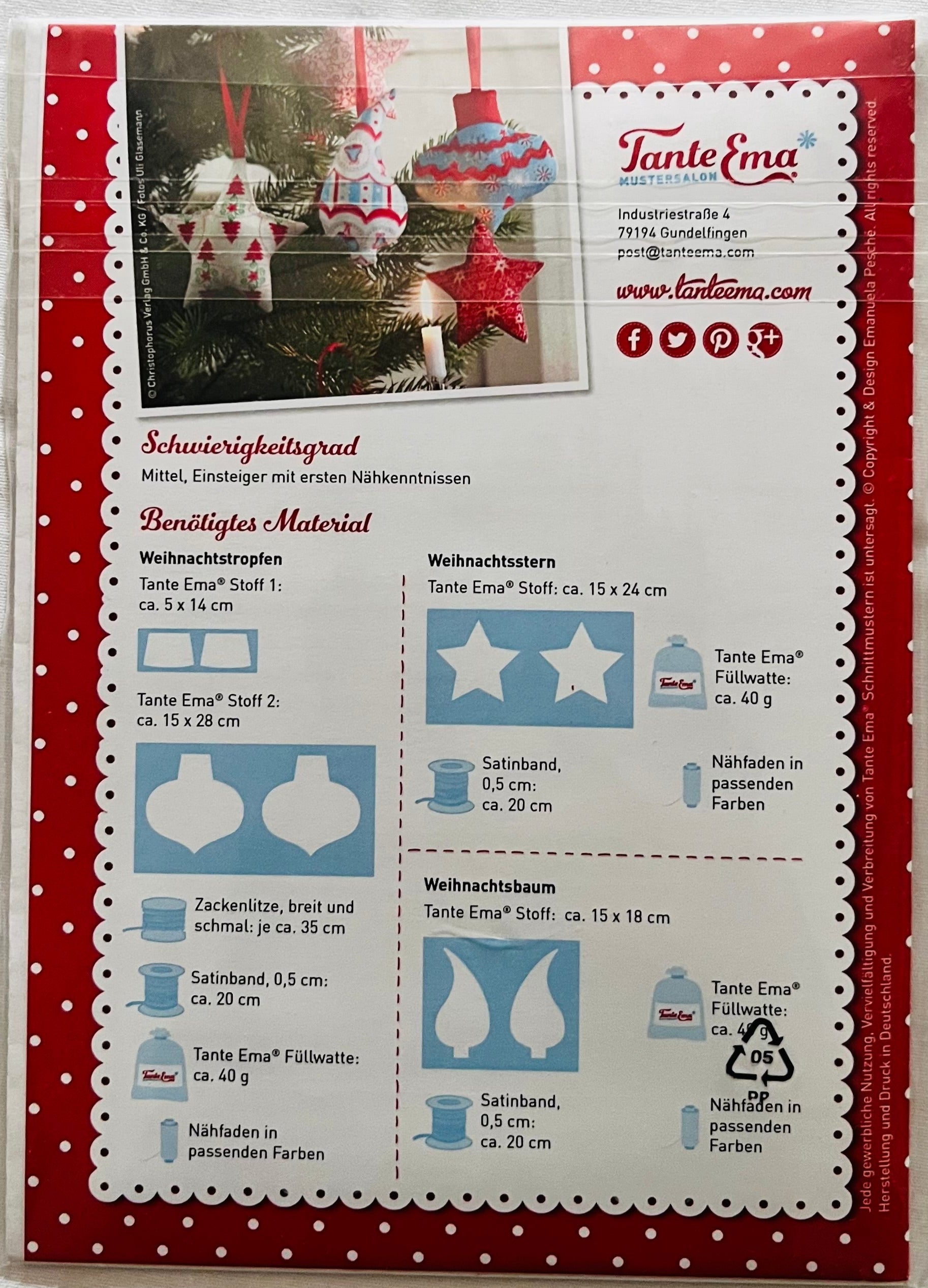 Tante Ema Schnittmuster - Kleines Nähglück Nr. 8: Weihnachtsanhänger Set 1 Tropfen, Stern, Baum