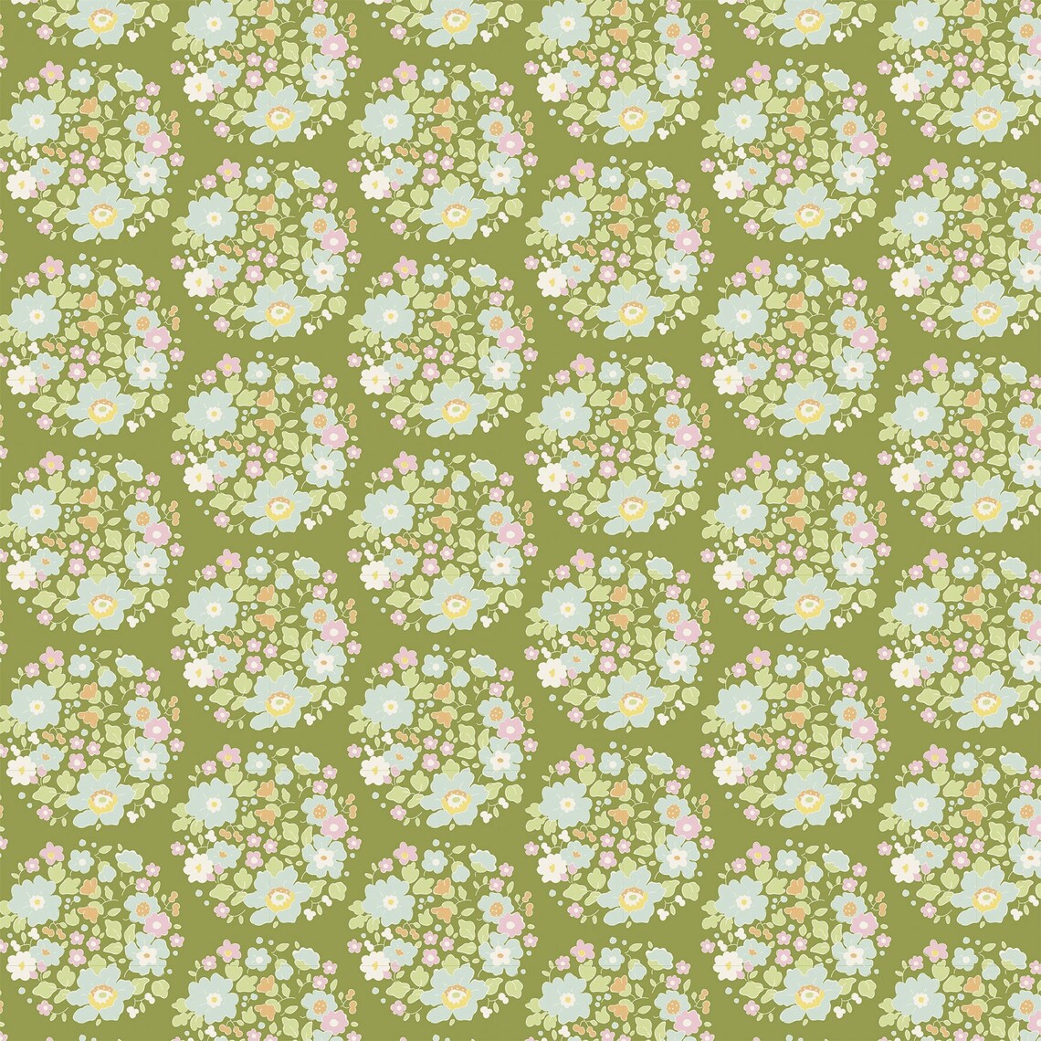 Tilda Baumwollstoff Flower Nest Green aus der Bumblebee-Kollektion Blumenstoff Grün Rosa Hellblau Cremeweiß Goldgelb
