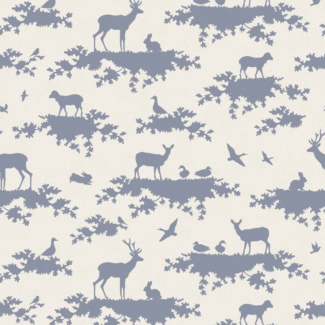 Tilda Baumwollstoff Forest Autumn Tree Blue aus der Woodland-Kollektion Cremeweiß Graublau Waldtiere