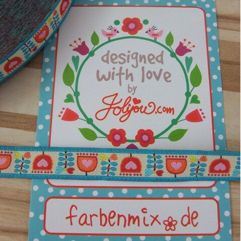 Das Webband Sweet Tulips von Farbenmix in frischem Jolijou-Design bringt fröhlichen Frühlingsflair in deine Nähprojekte. Kleine, stilisierte Tulpen in kräftigen Farben reihen sich harmonisch aneinander - perfekt für verspielte Akzente an Taschen, Kleidern, Accessoires oder Kleidung.